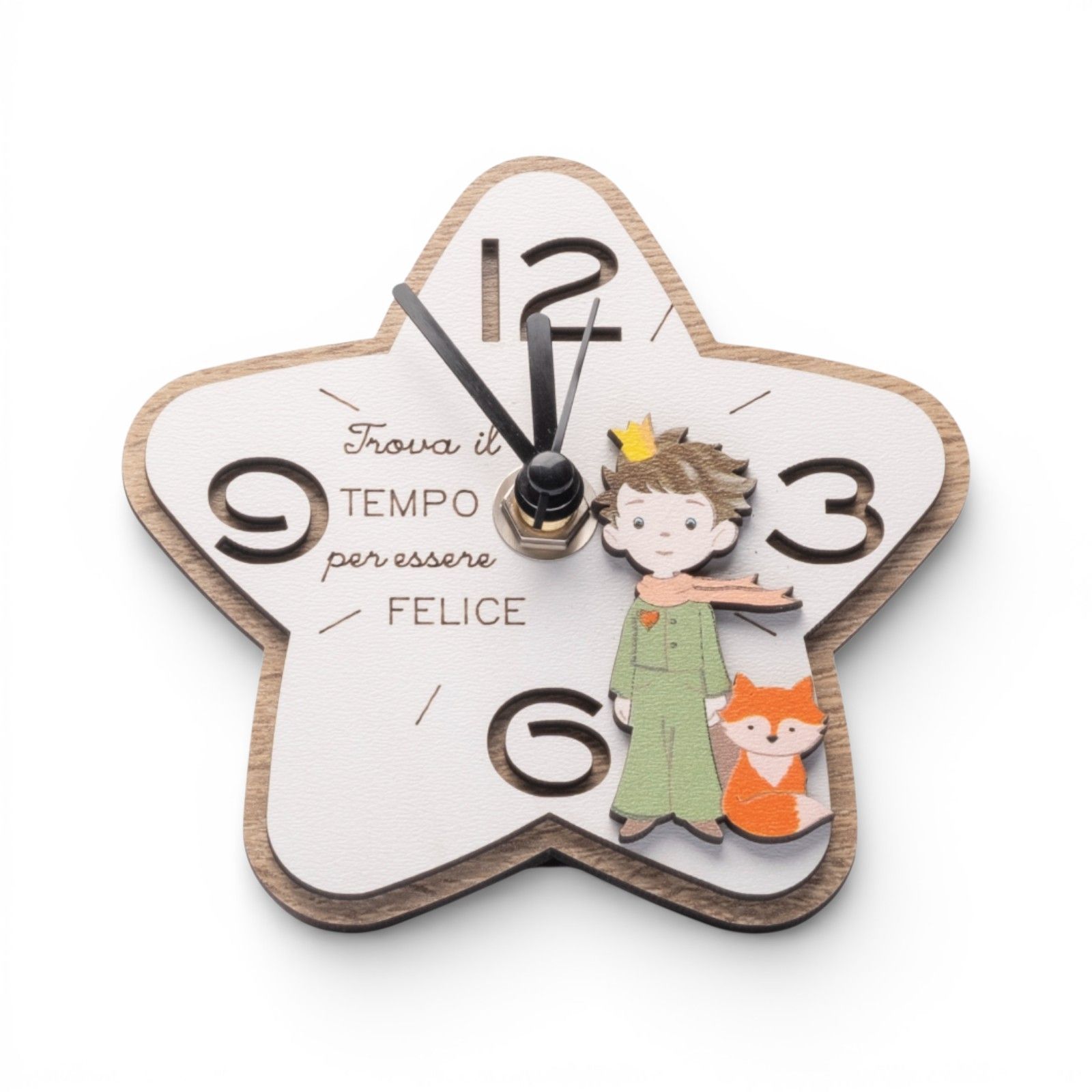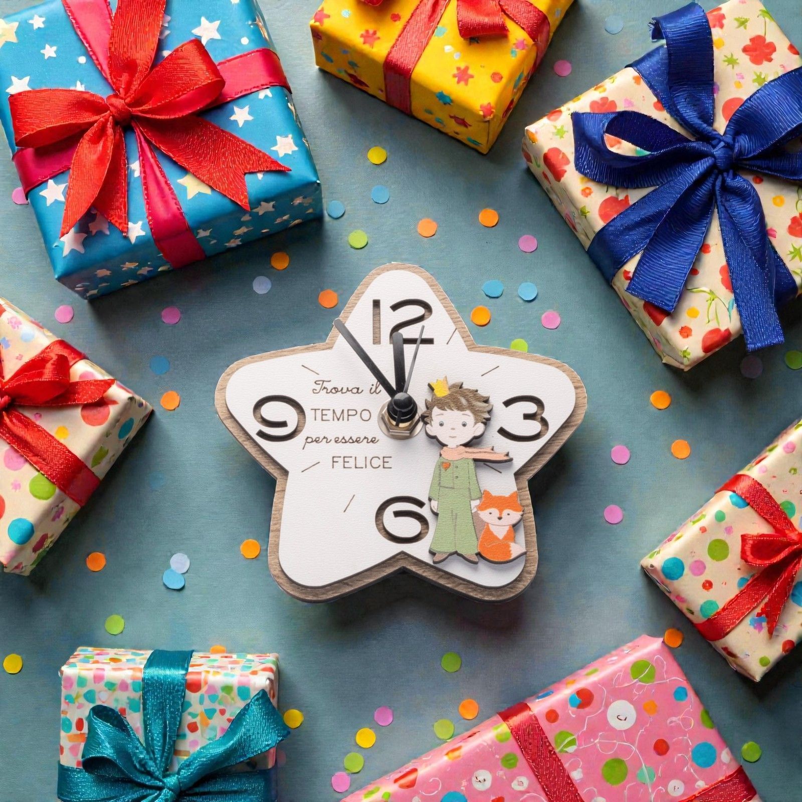 Porta un sorriso e un messaggio di gioia con il nostro orologio a forma di stella, un'elegante bomboniera che incarna la bellezza delle emozioni. Questo delizioso oggetto non è solo un complemento decorativo, ma un simbolo di un momento speciale, come un battesimo o una comunione. Con la frase "Trova il tempo per essere felice", ogni volta che lo si guarda, si è ricordati di godere delle piccole gioie della vita.