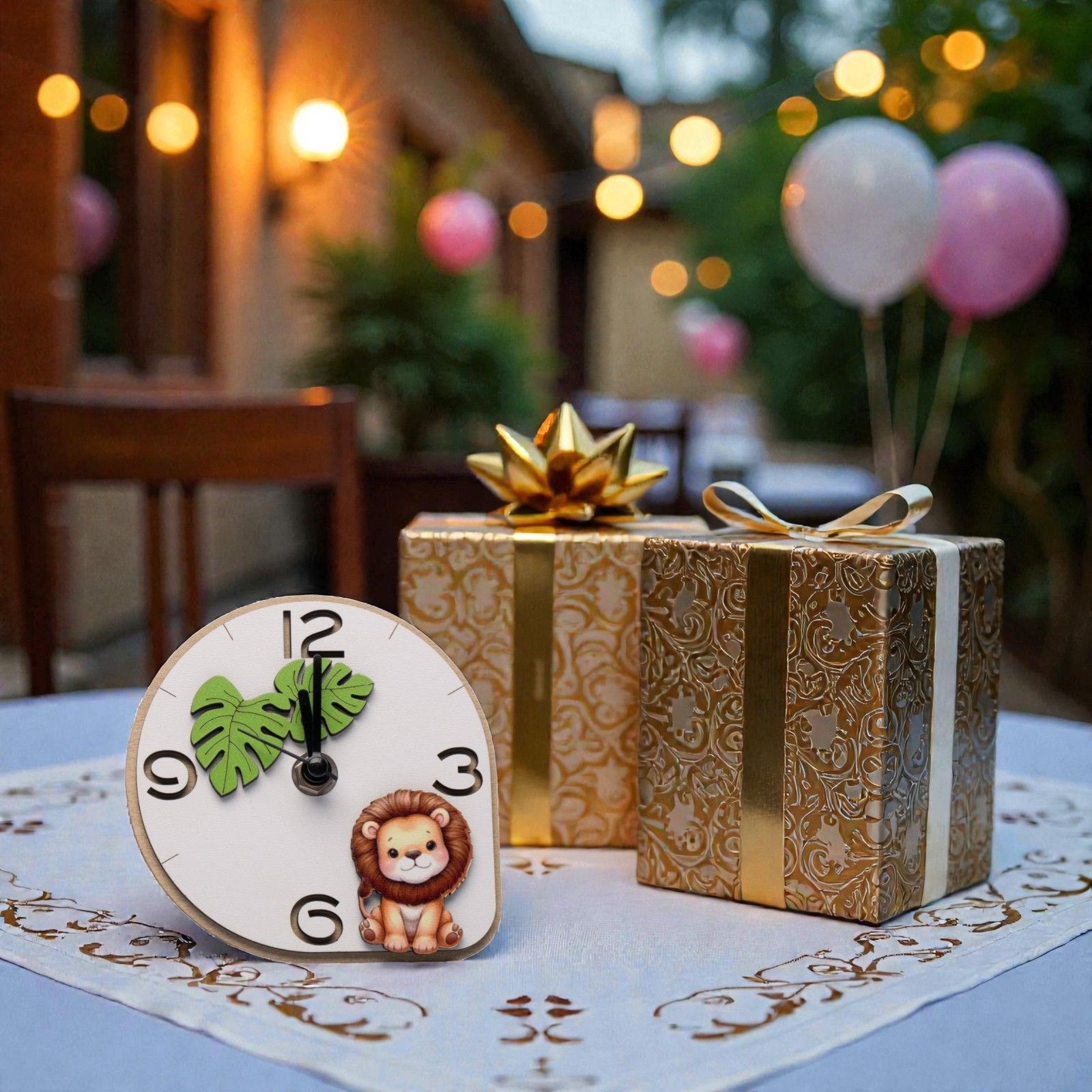 Lasciati conquistare dall’incanto di questo orologio tema giungla, un'affascinante bomboniera che racconta una storia di avventura e meraviglia. Ogni particolare, dalle delicate foglie ai piccoli dettagli del leoncino, è pensato per evocare la magia della natura. Questo regalo non è solo un oggetto, ma un simbolo di amore e condivisione, perfetto per celebrare momenti unici come battesimi e comunioni.