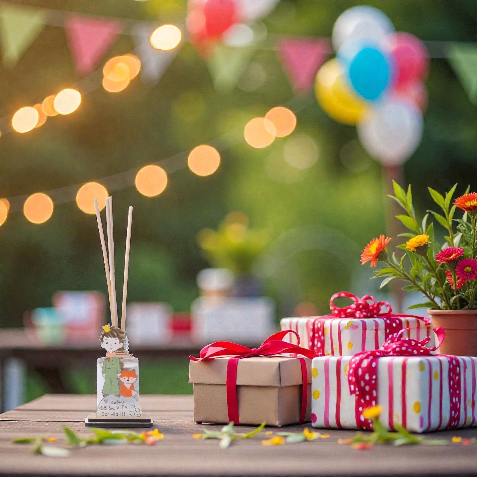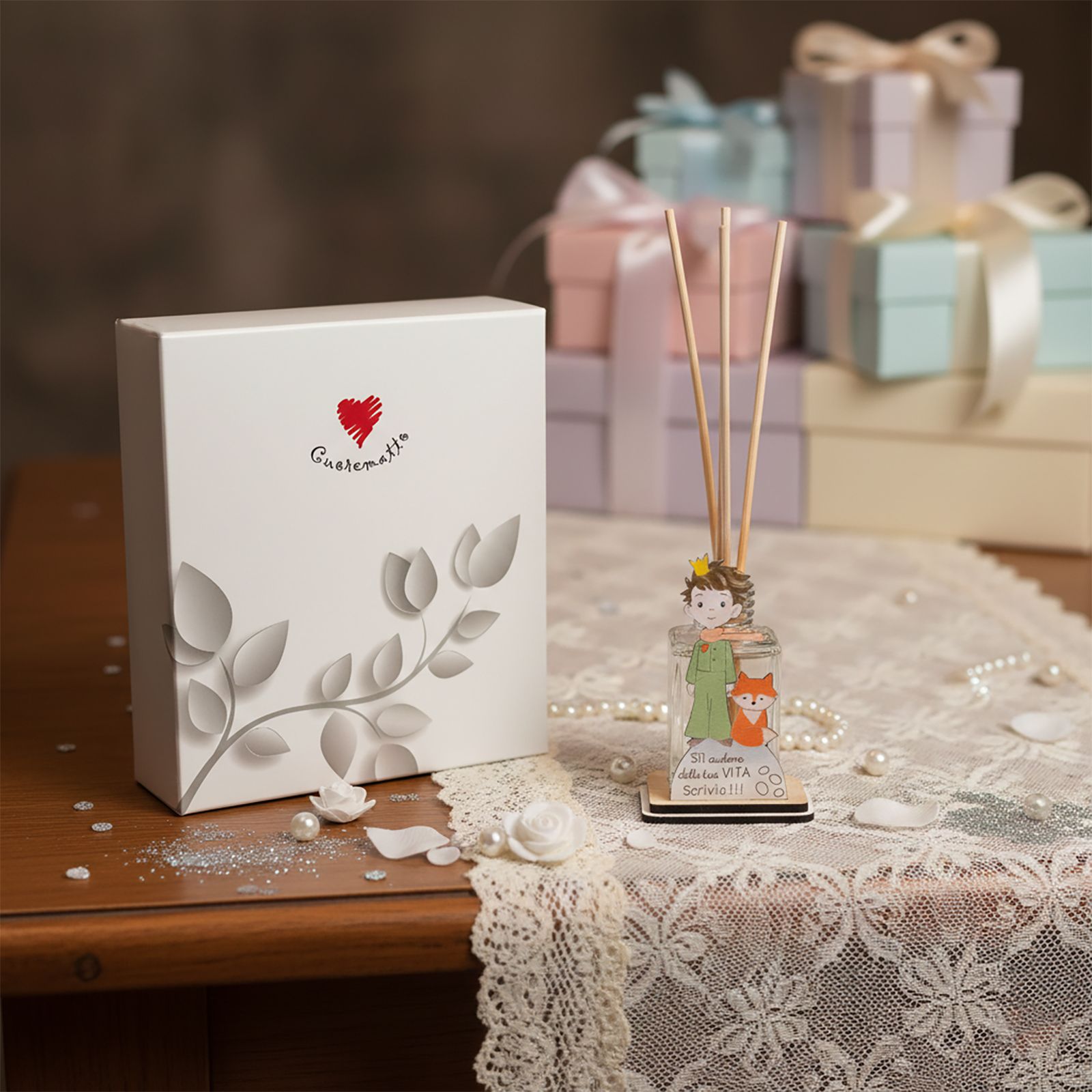 Ispirato al magico mondo del Piccolo Principe, questo delicato porta profumo è una bomboniera ricca di significato, ideale per celebrare momenti speciali come battesimi e comunioni.