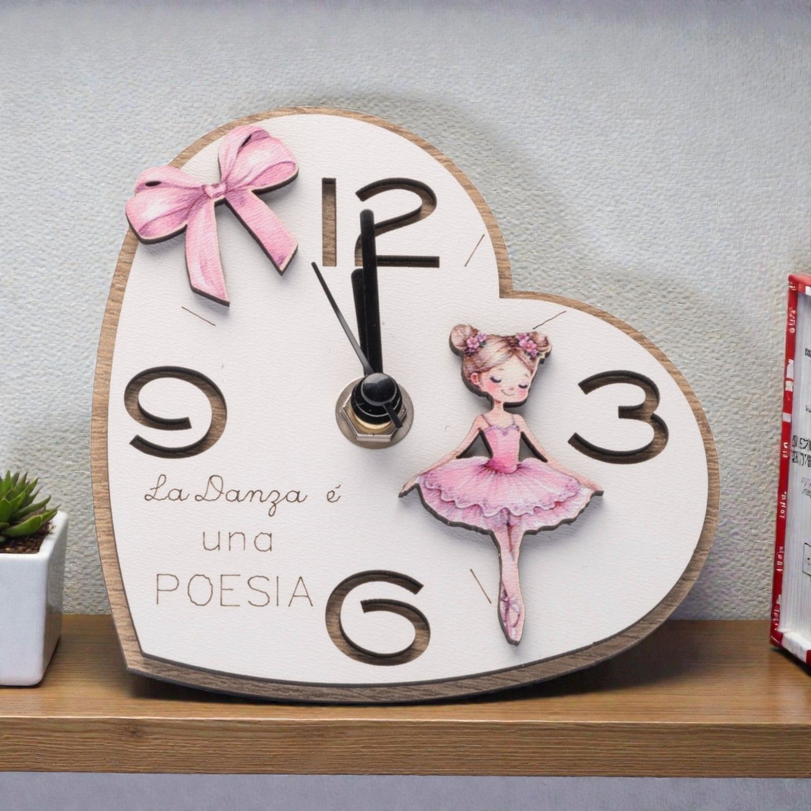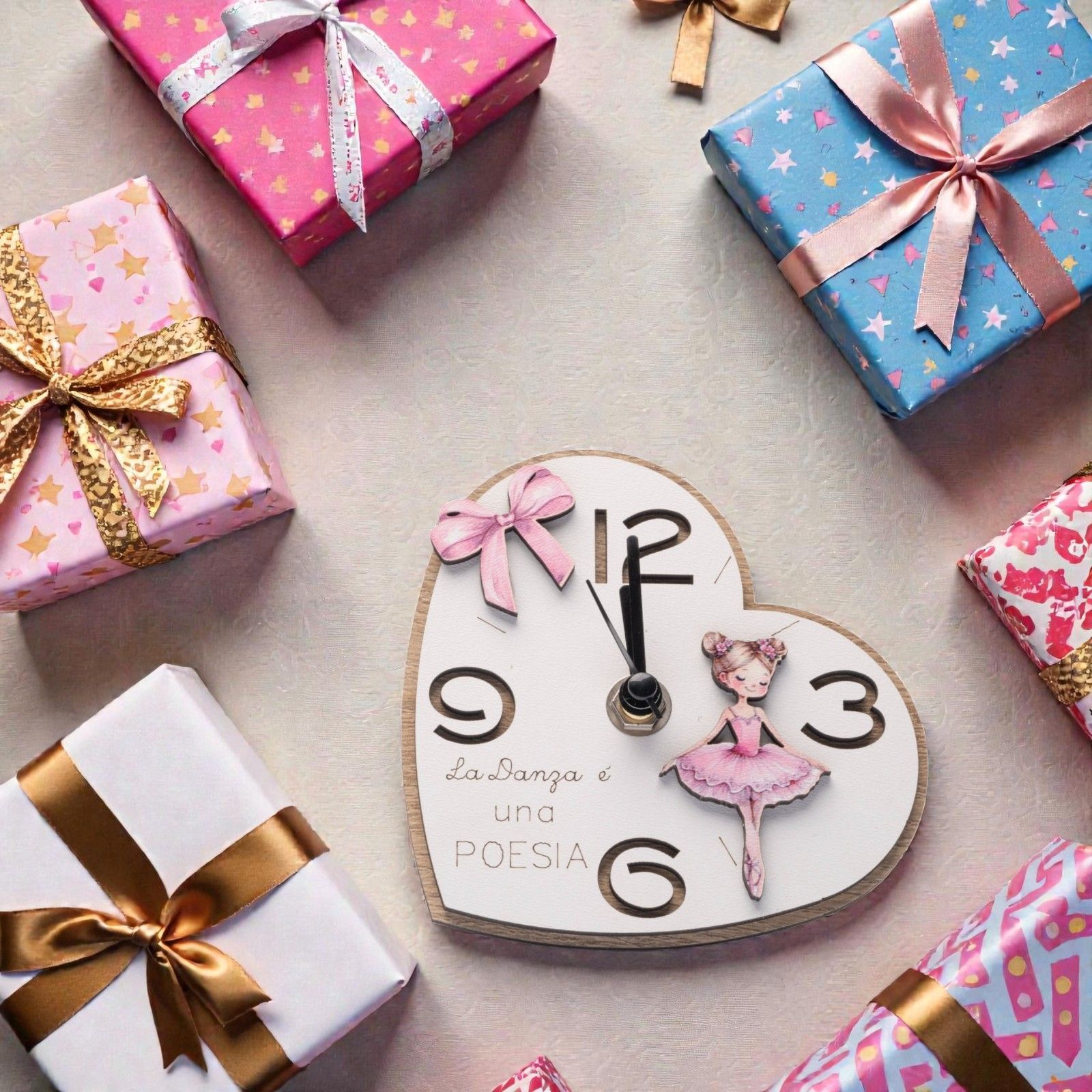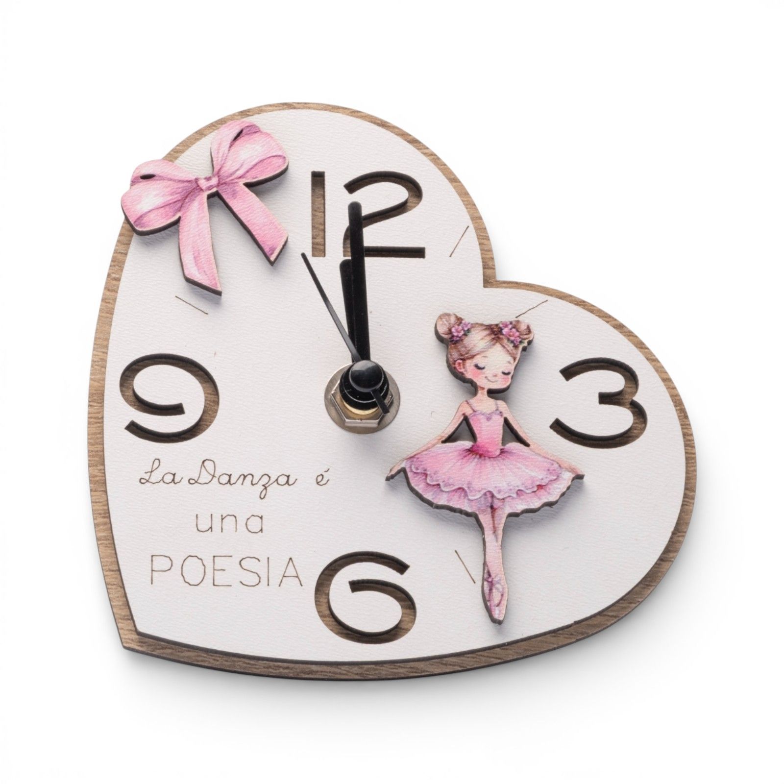Realizzato in legno nelle delicate tonalità bianca e rosa, questo accessorio unico è impreziosito da un tutu rosa e un fiocco, rendendolo un'aggiunta originale per qualsiasi festa. Ogni dettagliato elemento di design è pensato per trasmettere un messaggio profondo: "La danza è una poesia". Questo rende l'orologio non solo un'ottima bomboniera tema danza, ma anche un regalo che porta con sé un significato speciale.