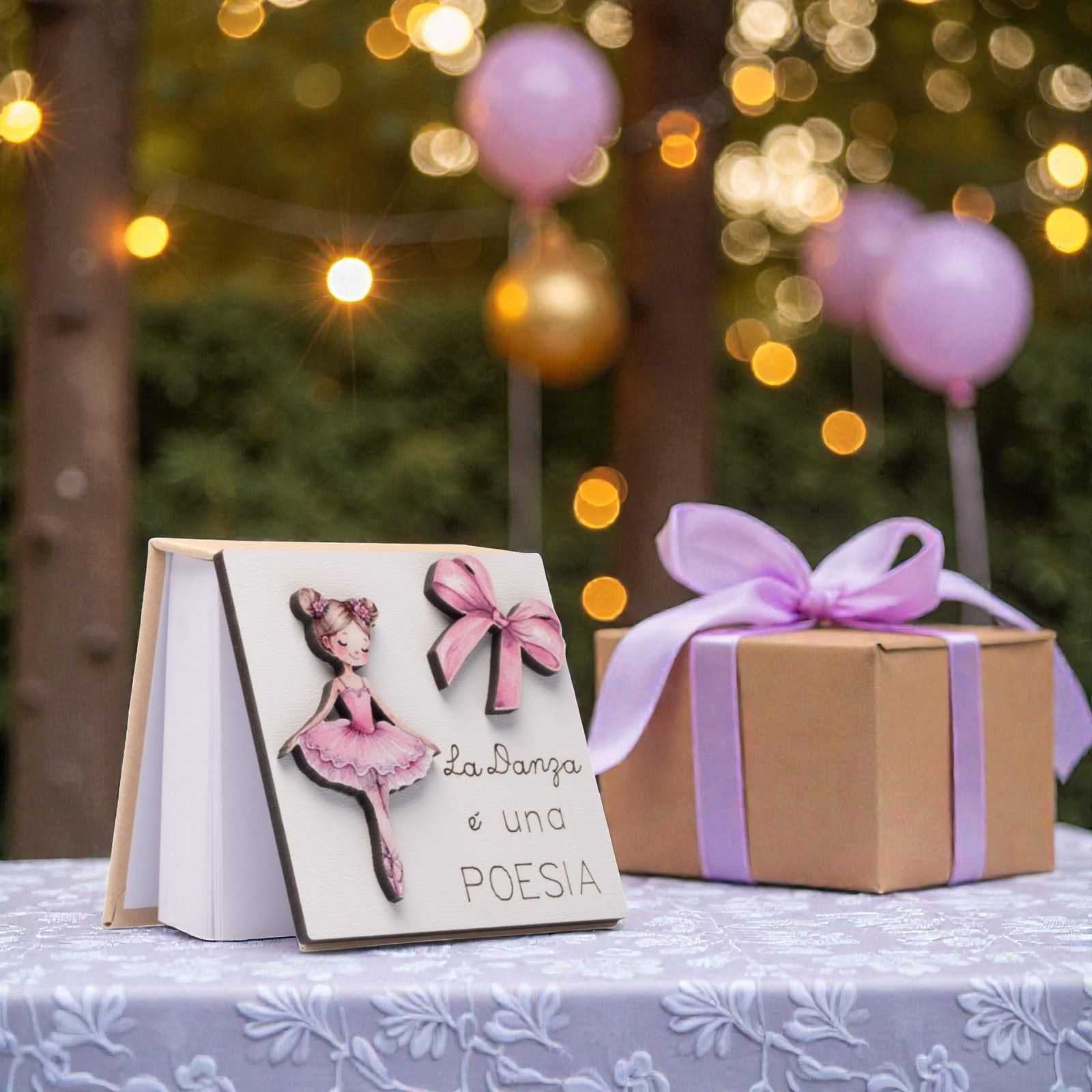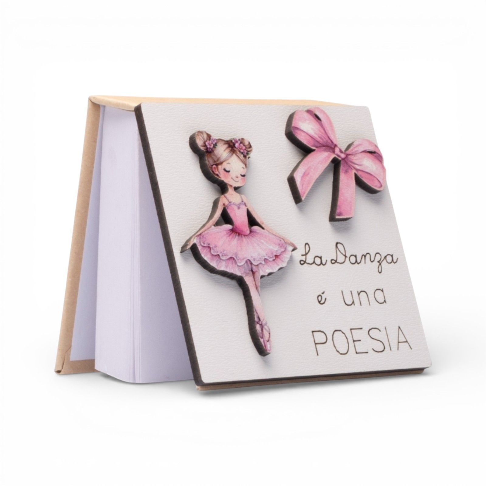 Immagina di regalare un sorriso e un ricordo speciale con le nostre bomboniere tema danza. Questo delizioso porta post-it con una ballerina in tutù rosa non è solo un oggetto, ma un simbolo di grazia e creatività. La frase "La danza è una poesia" sulla copertina risuona in modo profondo, rendendo ogni momento ancora più magico. Perfette per battesimi, primi compleanni e comunioni, queste bomboniere sono un omaggio all'infanzia e alla gioia di danzare nella vita.
