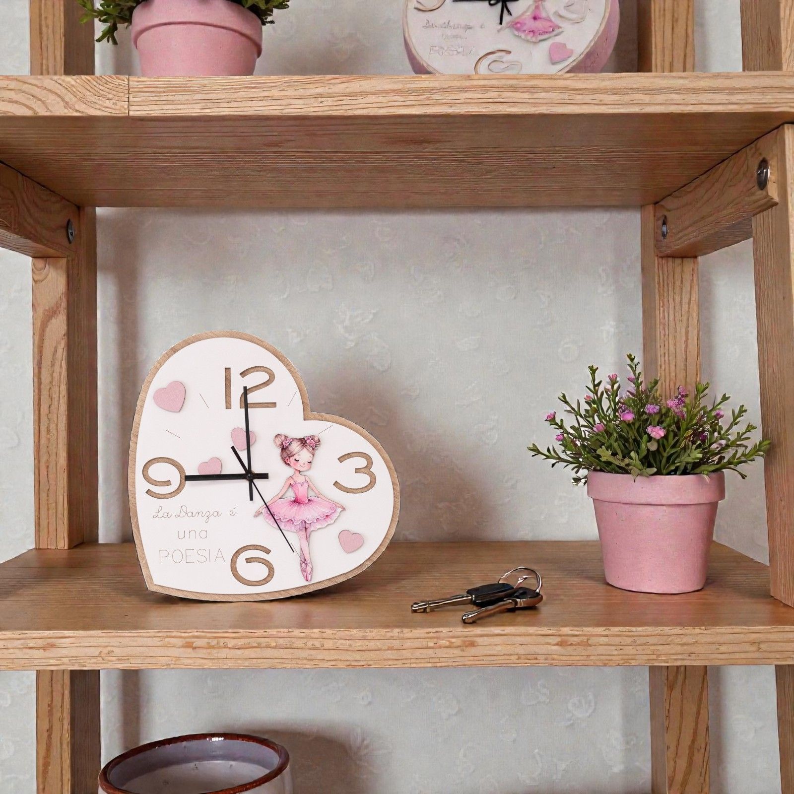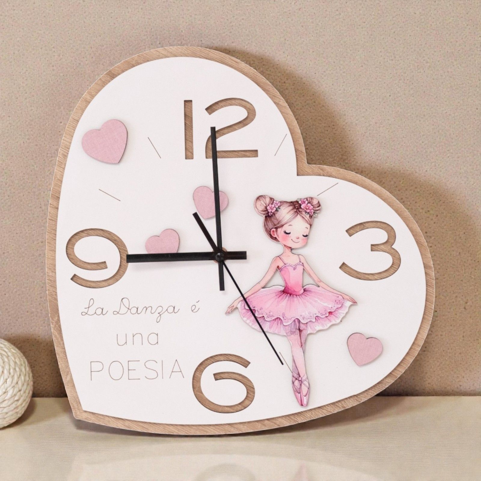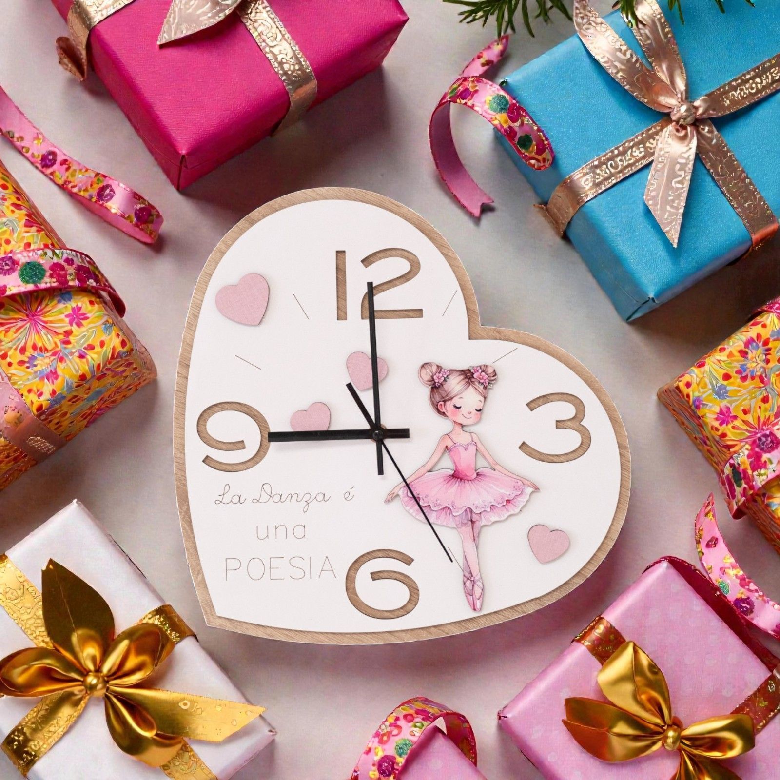 Un orologio da parete a forma di cuore che incarna la bellezza e la grazia della danza. Questo straordinario pezzo non è solo un accessorio decorativo, ma un simbolo di amore e passione per l'arte della danza. Perfetto come bomboniera tema danza per celebrare momenti speciali come battesimi, primi compleanni e comunioni, questo orologio racconta una storia di sogni e aspirazioni.