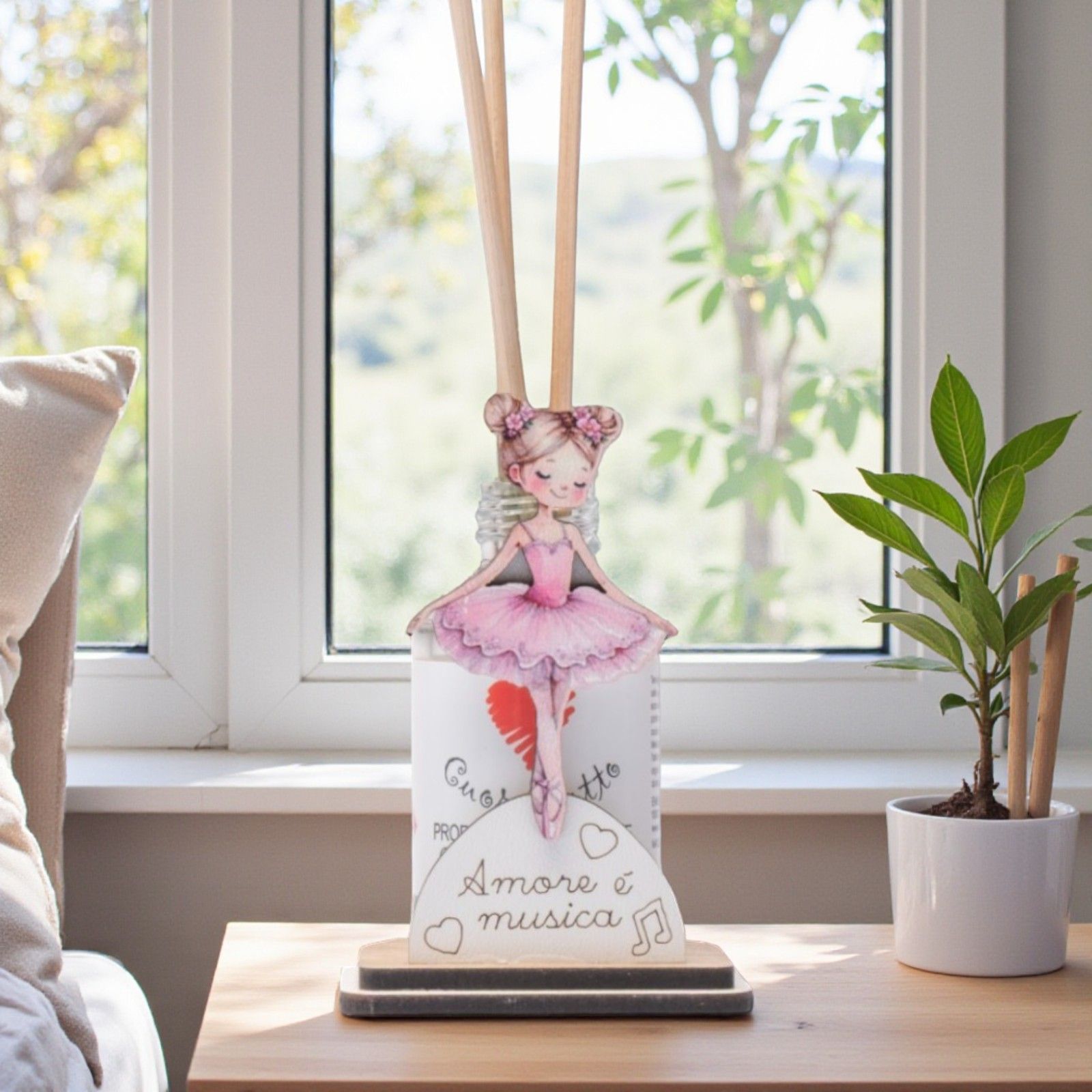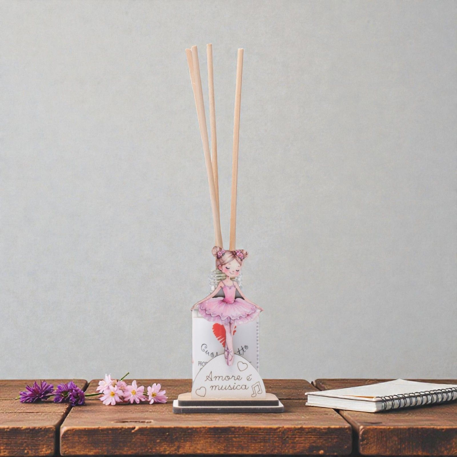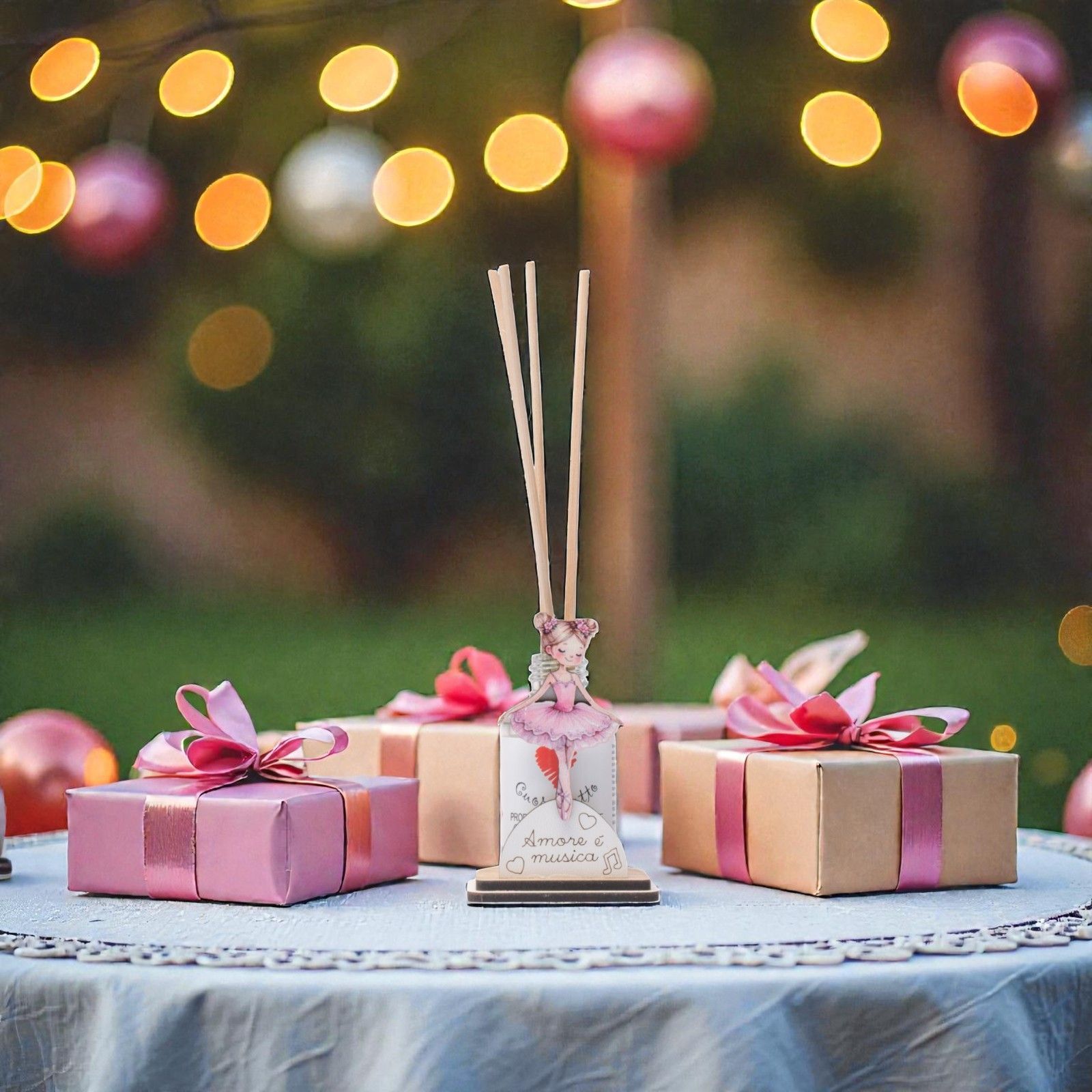 Lasciati avvolgere dalla dolce melodia dell'amore con il nostro diffusore essenza raffigurante una graziosa ballerina sulle punte. Questo elegante oggetto non è solo un accessorio decorativo, ma un simbolo di gioia e armonia, perfetto per celebrare momenti speciali come battesimi, primi compleanni e comunioni. La frase “Amore è musica” racchiude l’essenza di ogni celebrazione, trasmettendo sentimenti di affetto e connessione.