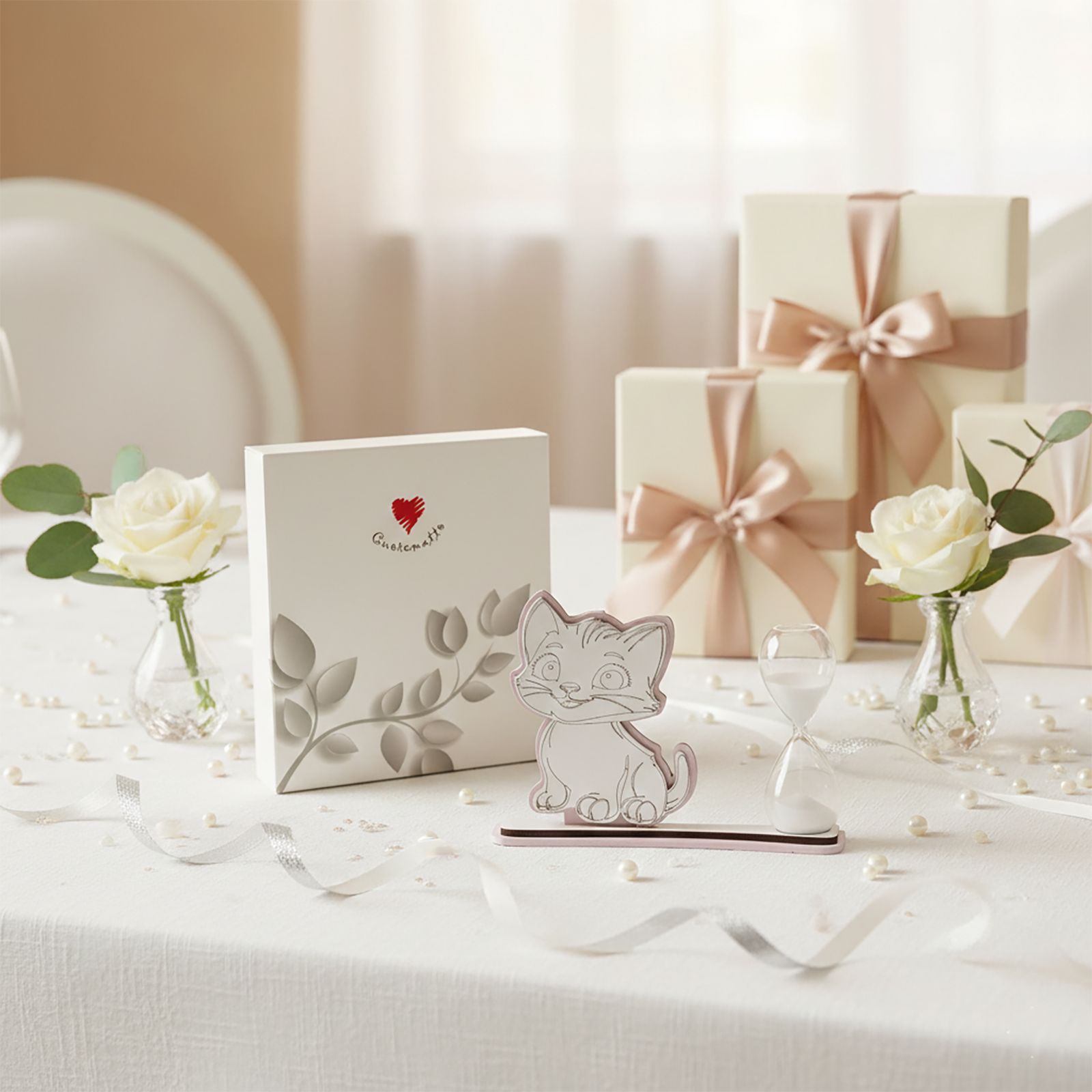 Immagina un momento speciale, un battesimo o un primo compleanno, dove ogni dettaglio racconta una storia d’amore e di affetto. La nostra clessidra con gattino è molto più di una semplice decorazione: è una bomboniera originale che racchiude in sé la dolcezza dell'infanzia e la magia dell'amicizia. Sorprendi i tuoi ospiti con un regalo che simboleggia il tempo prezioso trascorso insieme, un regalo che rimarrà nel cuore di tutti.