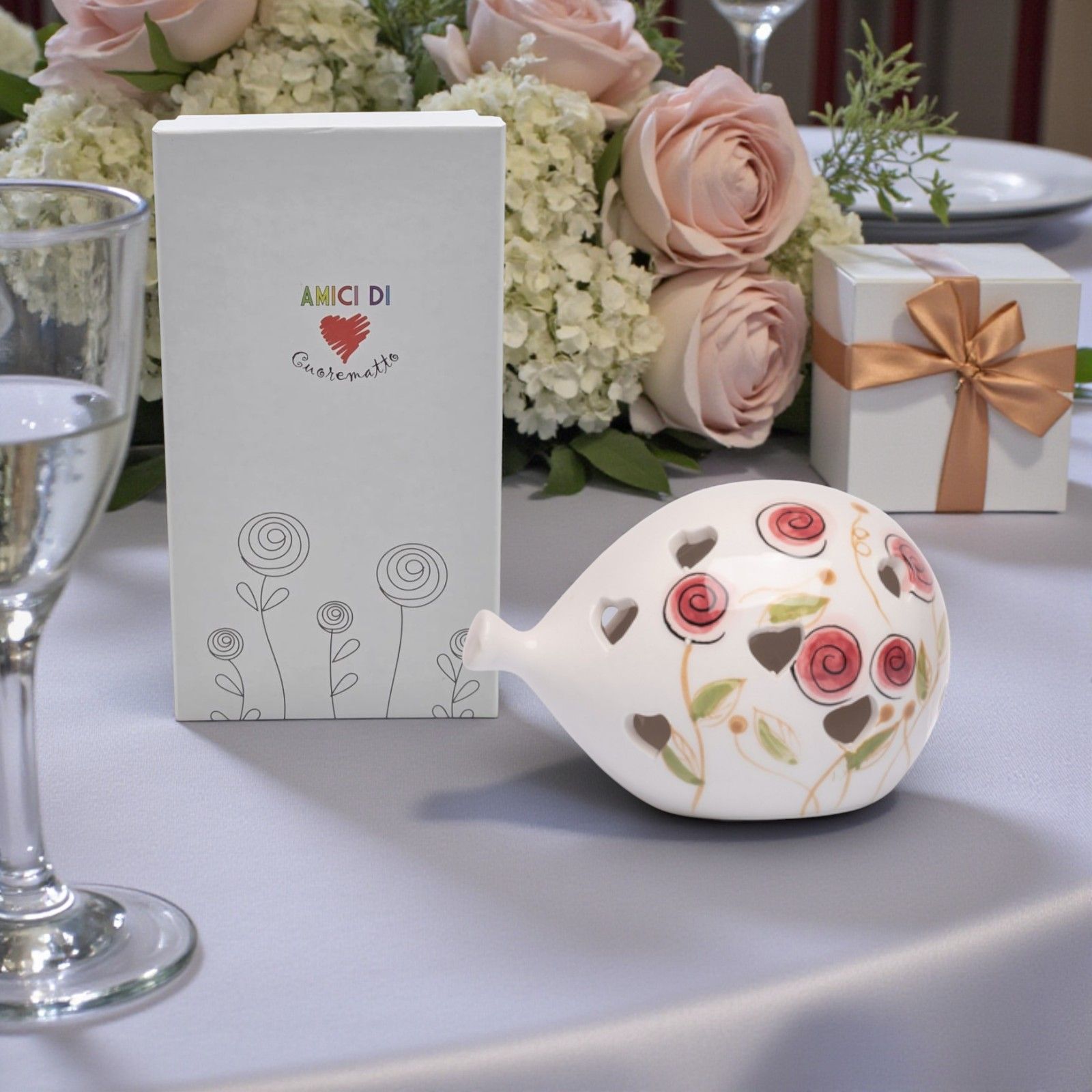Realizzata in ceramica di alta qualità, questa bomboniera originale è un perfetto esempio di eleganza e raffinatezza. La combinazione di colori, con il bianco puro e i boccioli rosa, la rende ideale per chi desidera regalare un pensiero unico e significativo, come le bomboniere battesimo bimba o le bomboniere comunione bimba. Ogni lampada è confezionata in una scatola regalo elegante, pronta per stupire i tuoi ospiti.