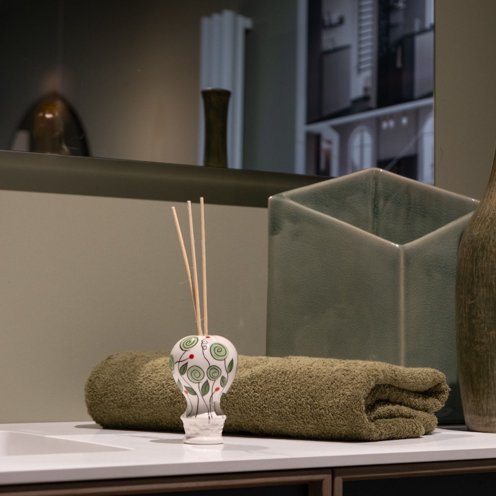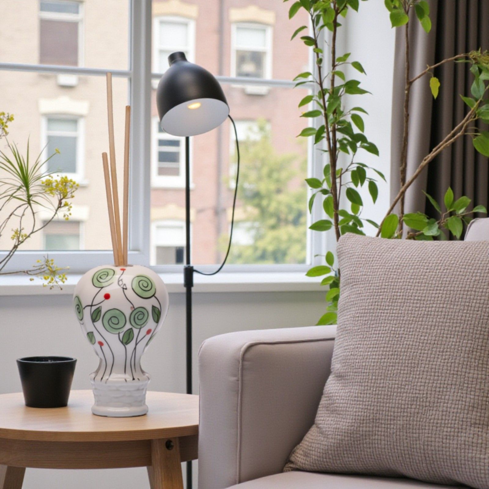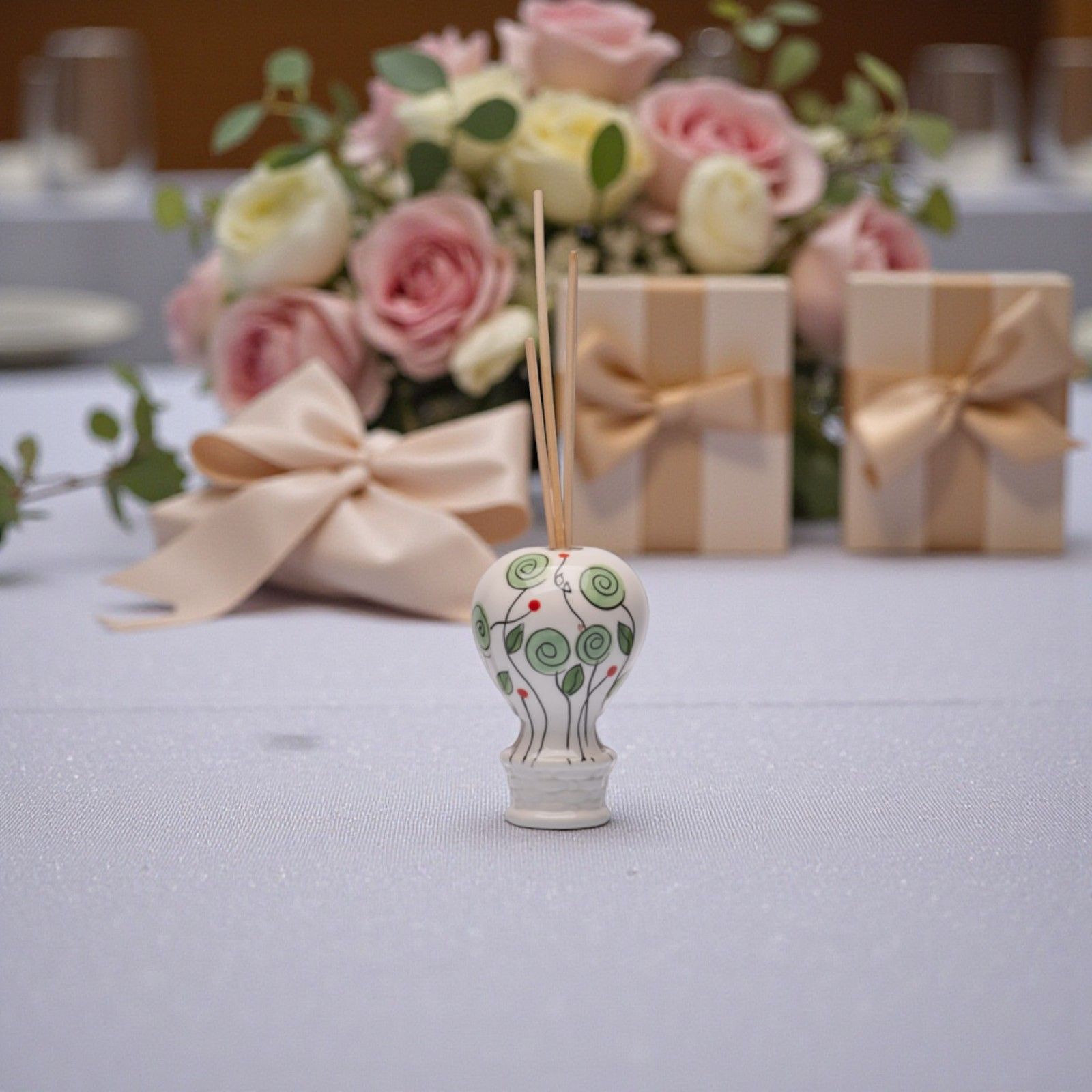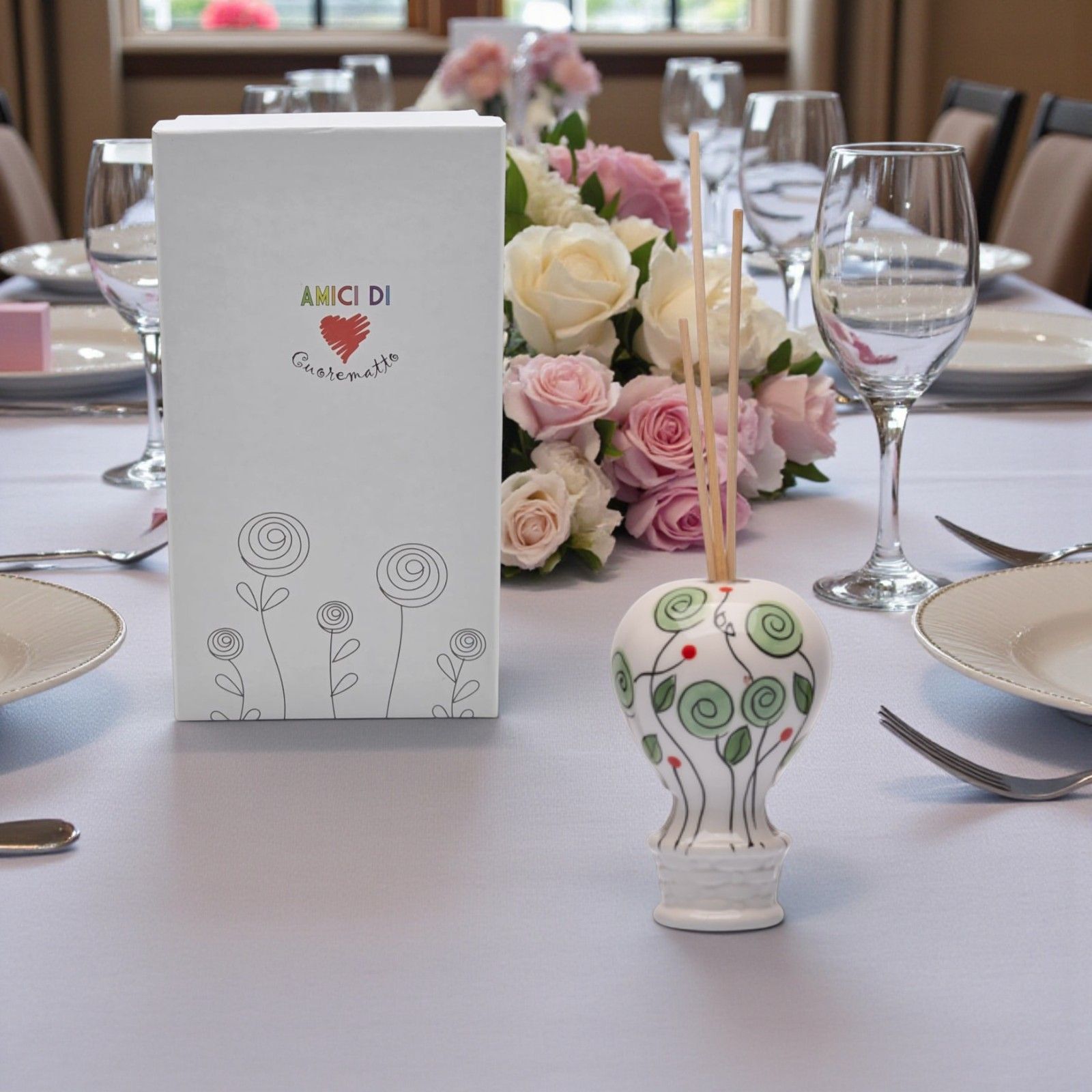 Realizzato in ceramica di alta qualità, il nostro profumatore è curato nei minimi dettagli. Il colore bianco con boccioli verdi evoca sensazioni di tranquillità e armonia, rendendolo un regalo originale e utile. Ogni pezzo è accompagnato da una scatola regalo e bastoncini inclusi, per un’esperienza di donazione completa e raffinata.