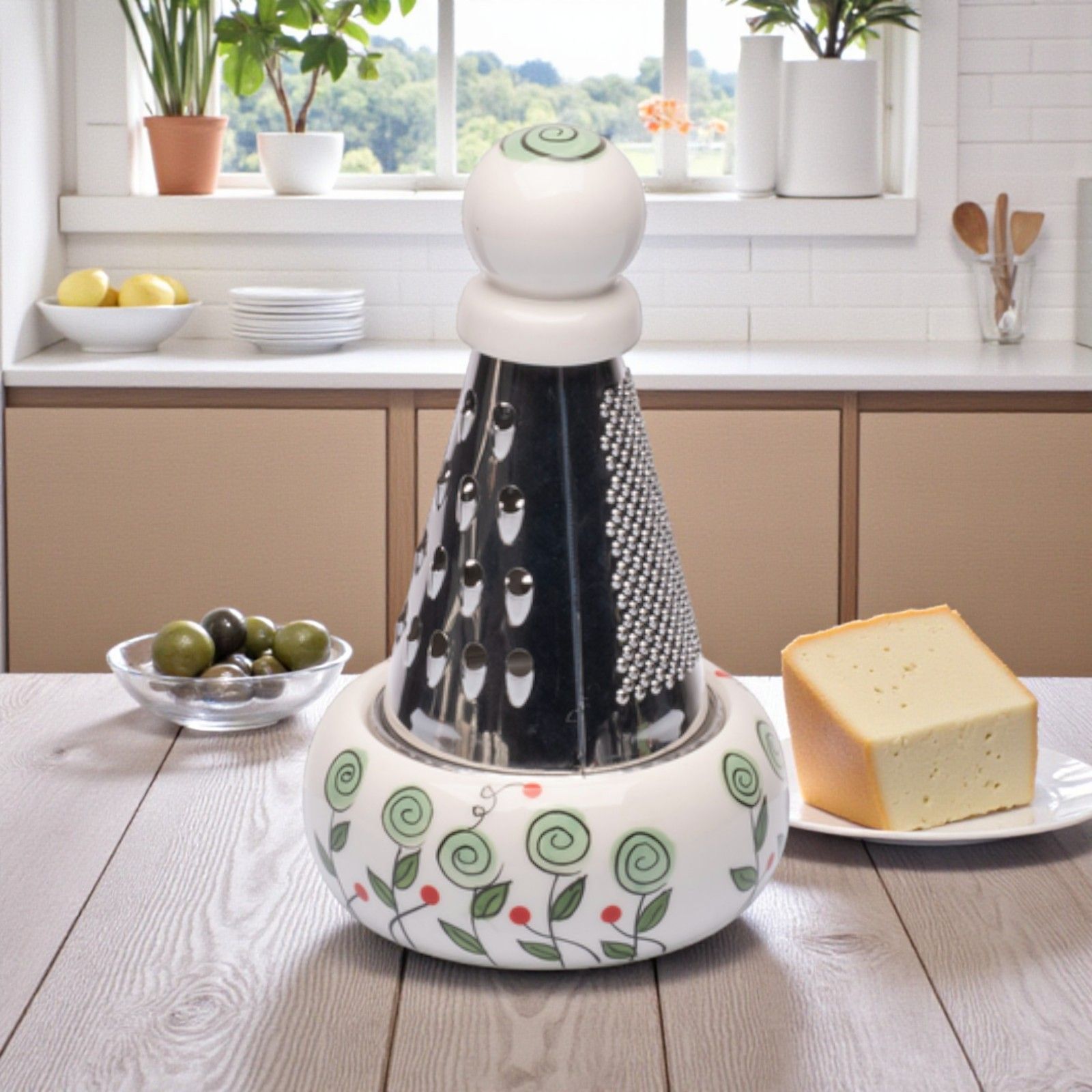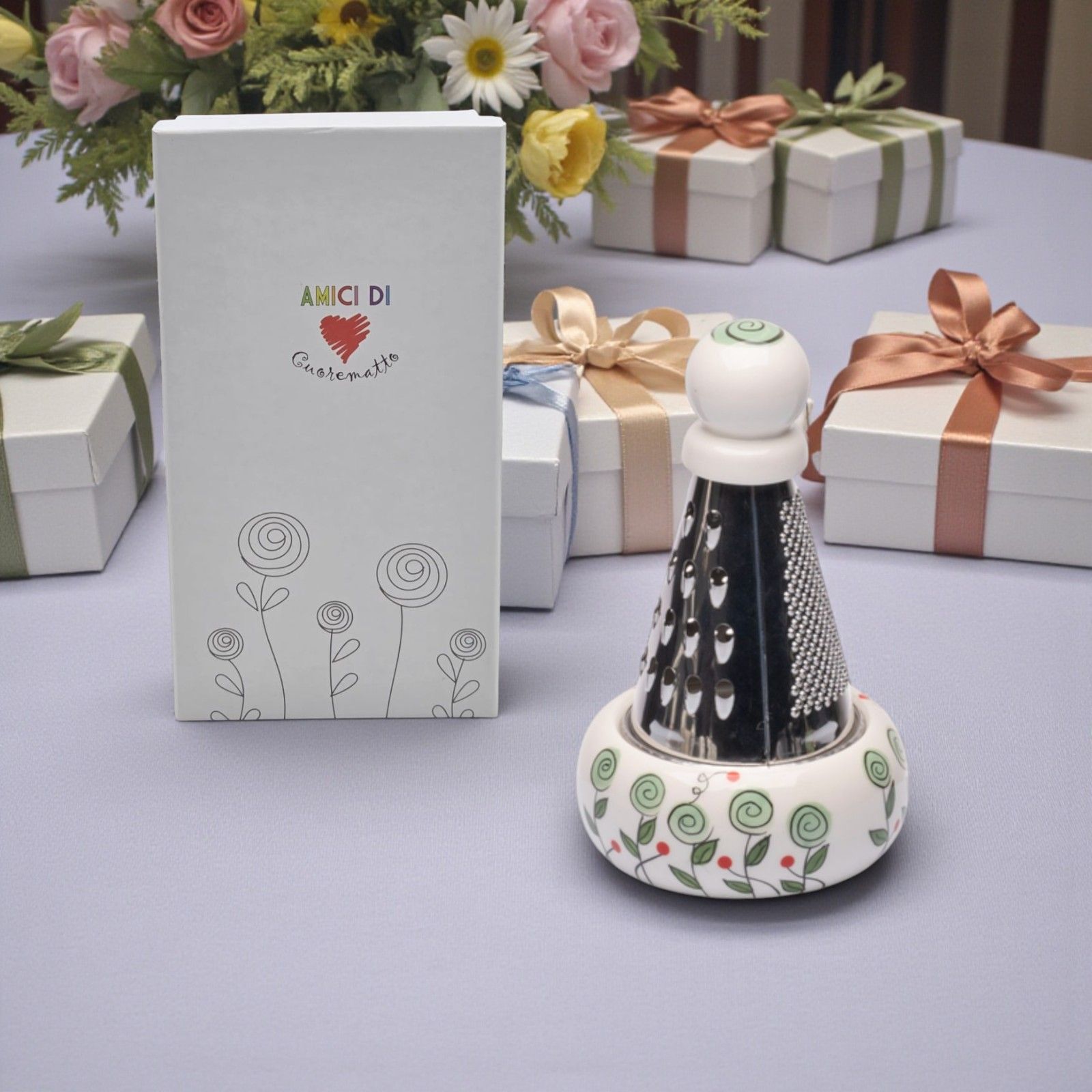 Realizzata in ceramica di alta qualità, questa grattuggia è un perfetto connubio tra funzionalità e bellezza. I boccioli verdi, dipinti a mano, aggiungono un tocco di freschezza e vivacità, trasformando un oggetto quotidiano in una vera e propria opera d’arte. Scegli questa bomboniera utile per sorprendere i tuoi ospiti con un pensiero che durerà nel tempo.