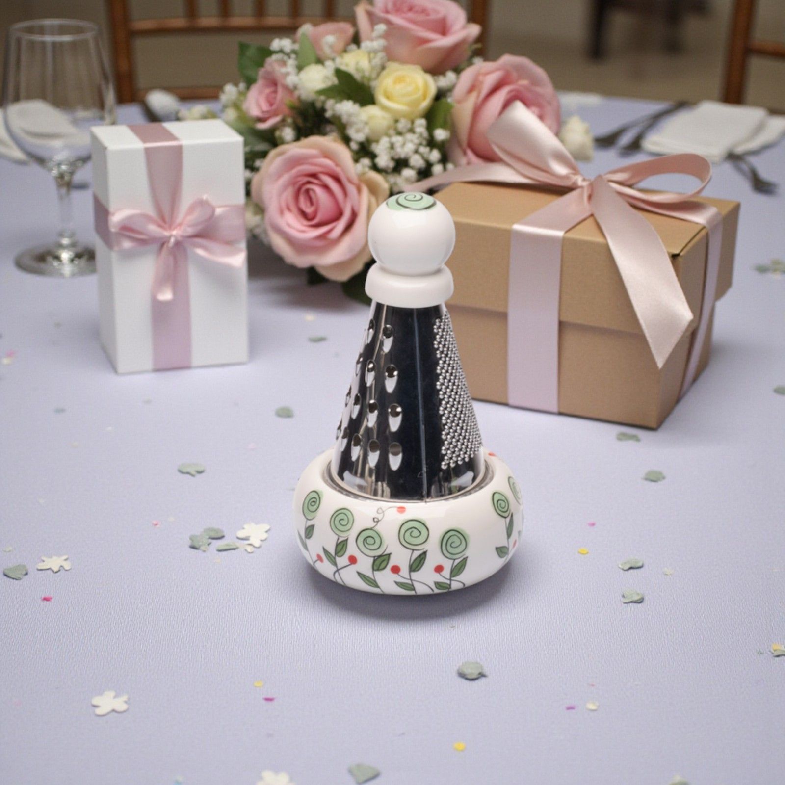 Immagina di donare un ricordo che parla direttamente al cuore. La grattuggia multiuso dipinta a mano con eleganti boccioli verdi non è solo un oggetto da cucina, ma un simbolo di amicizia e affetto. Ogni volta che la utilizzerai, ricorderai i momenti speciali trascorsi con le persone che ami. Questa bomboniera solidale rappresenta un gesto di cura e attenzione per chi riceve, rendendola un'idea originale per matrimoni e anniversari.