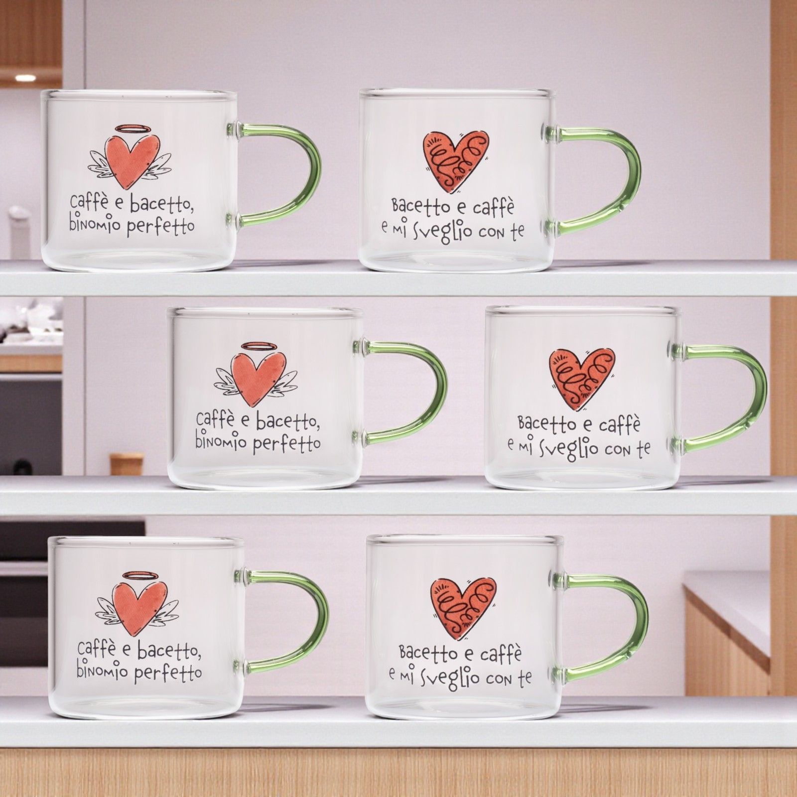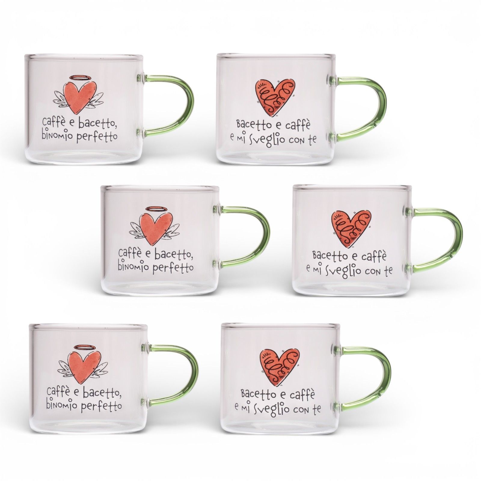 Ogni bomboniera racconta una storia d'amore e di gratitudine, e il nostro set di 6 tazzine assortite è il regalo perfetto per rendere indimenticabili eventi speciali come il tuo matrimonio o un anniversario. Realizzate in elegante vetro borosilicato, queste tazzine trasparenti con cuore rosso e scritte nere trasmettono un messaggio di affetto e amicizia, perfette per celebrare momenti unici con i tuoi amici di cuorematto.
