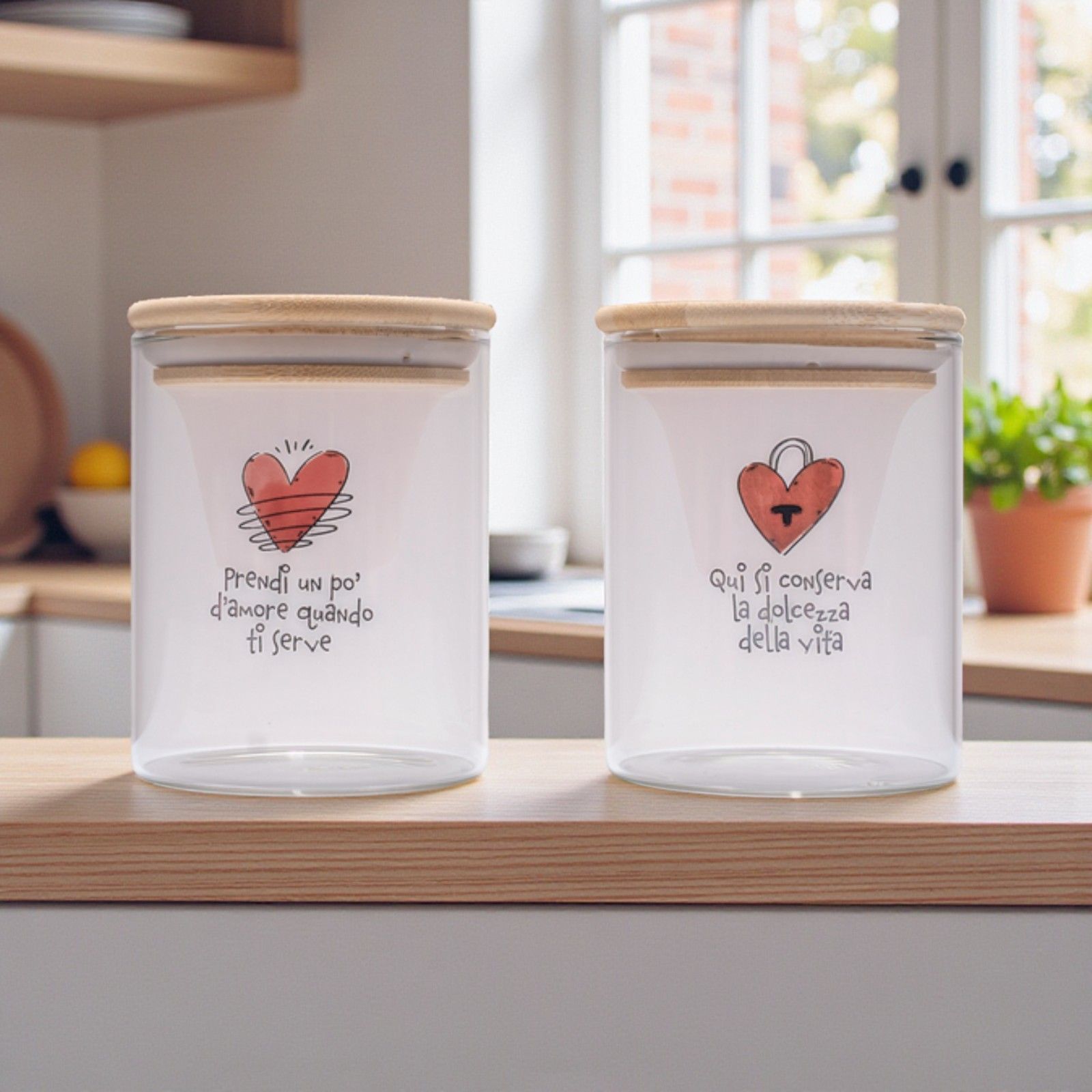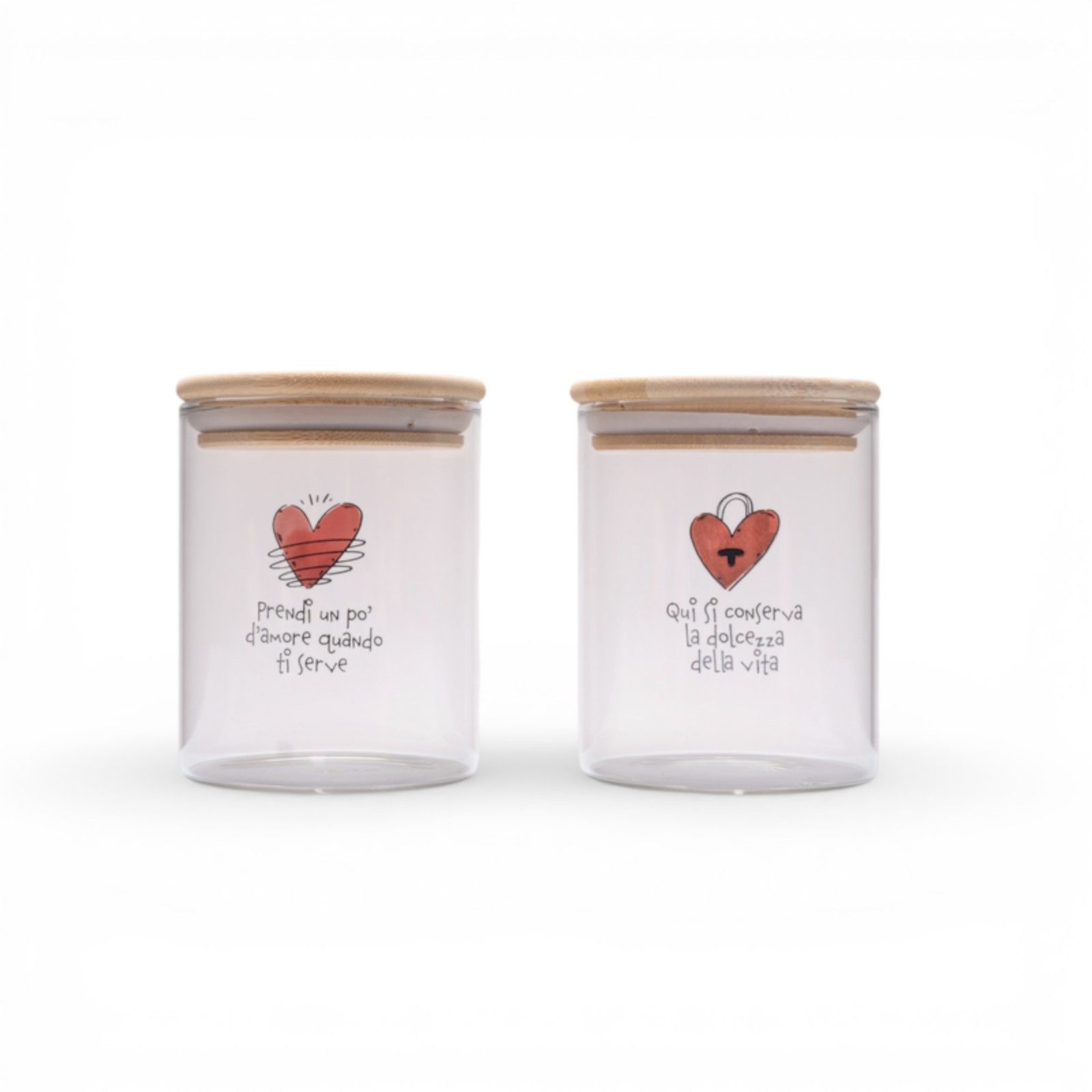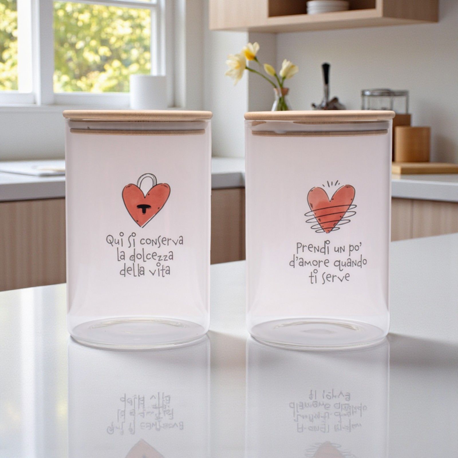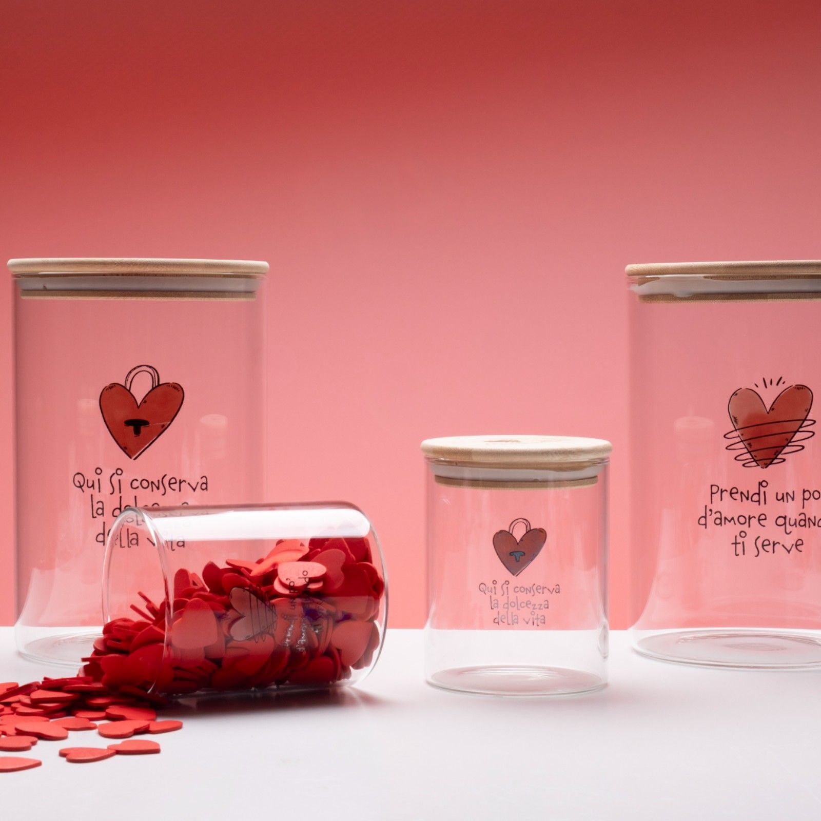 Lasciati avvolgere dalla dolcezza e dall'emozione di un gesto significativo con il nostro barattolo con coperchio assortiti. Questo speciale contenitore è molto più di un semplice oggetto: è un idea regalo che racchiude l'essenza dell'amore e della condivisione. “Prendi un pò d'amore quando ti serve” e “Qui si conserva la dolcezza della vita” sono le frasi che accompagneranno i tuoi momenti più belli, rendendo ogni evento indimenticabile.