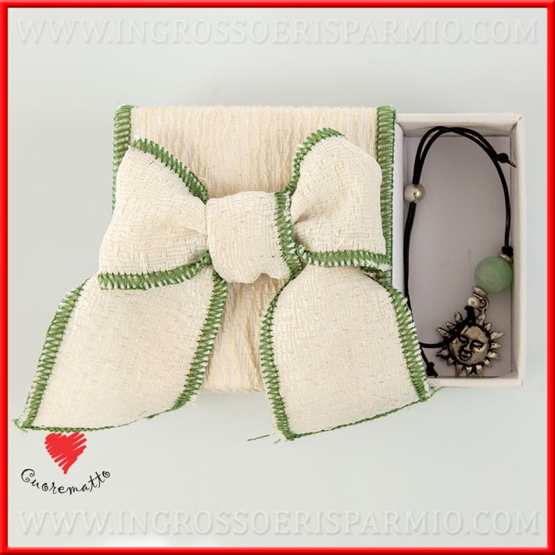 - verde: fiocco con riporti verdi per bomboniere 18 anni, battesimo e comunione bimbo con braccialetti assortiti in 3 varianti, sole, farfalla e smile.