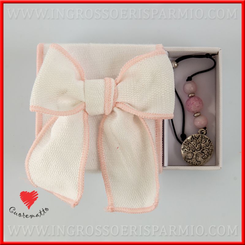 - rosa: fiocco con bordi rosa, per idee battesimo e comunione bambina, con bracciale e ciondoli albero della vita, assortiti in 3 varianti.