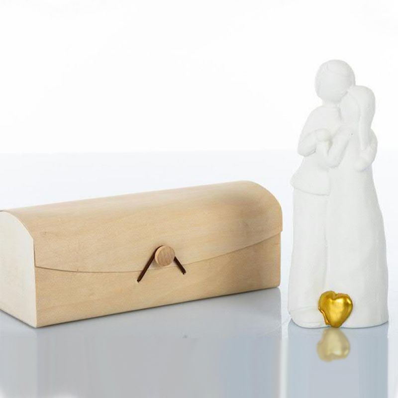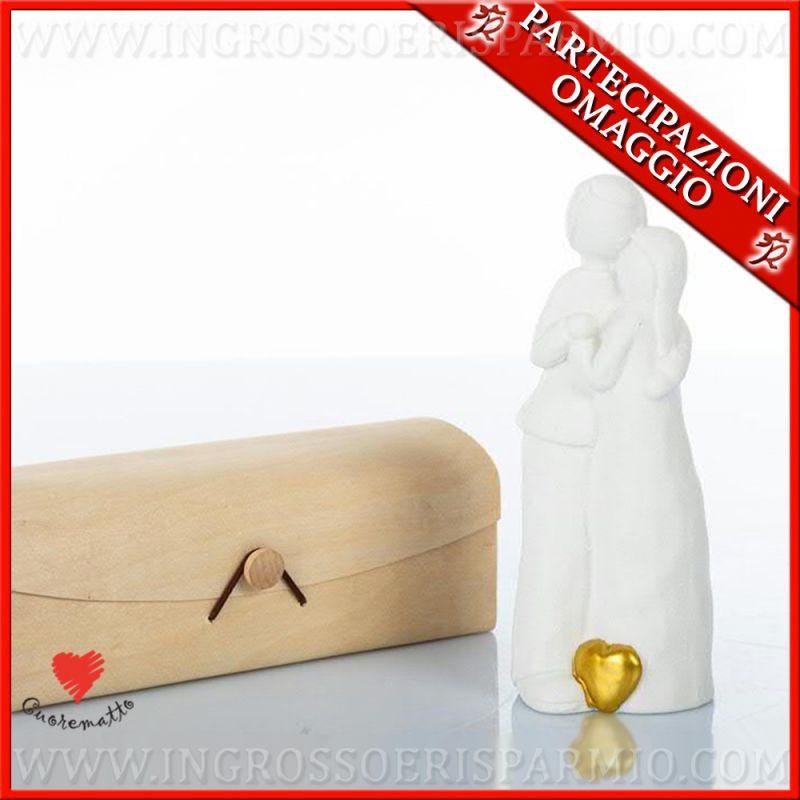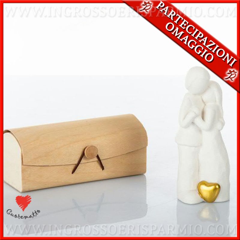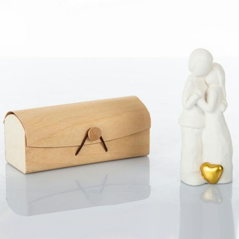 Statuette in ceramica biscuit bianca, con coppia lui e lei, stilizzati, raffigurati abbracciati. Alla base un cuoricino dipinto in oro, arricchisce queste speciali bomboniere solidali matrimonio.