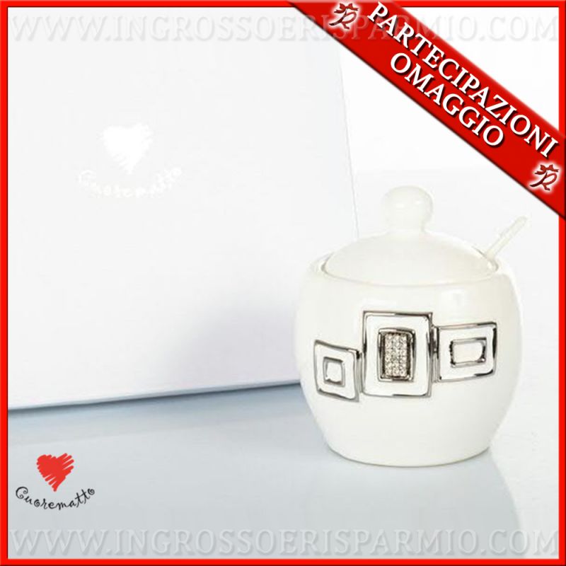 Elegante zuccheriera in ceramica bianca, forma rotonda, con inserti color silver e strass luminosi. Completa di cucchiaino in ceramica e scatola regalo! Bomboniere solidali matrimonio firmate Cuorematto!