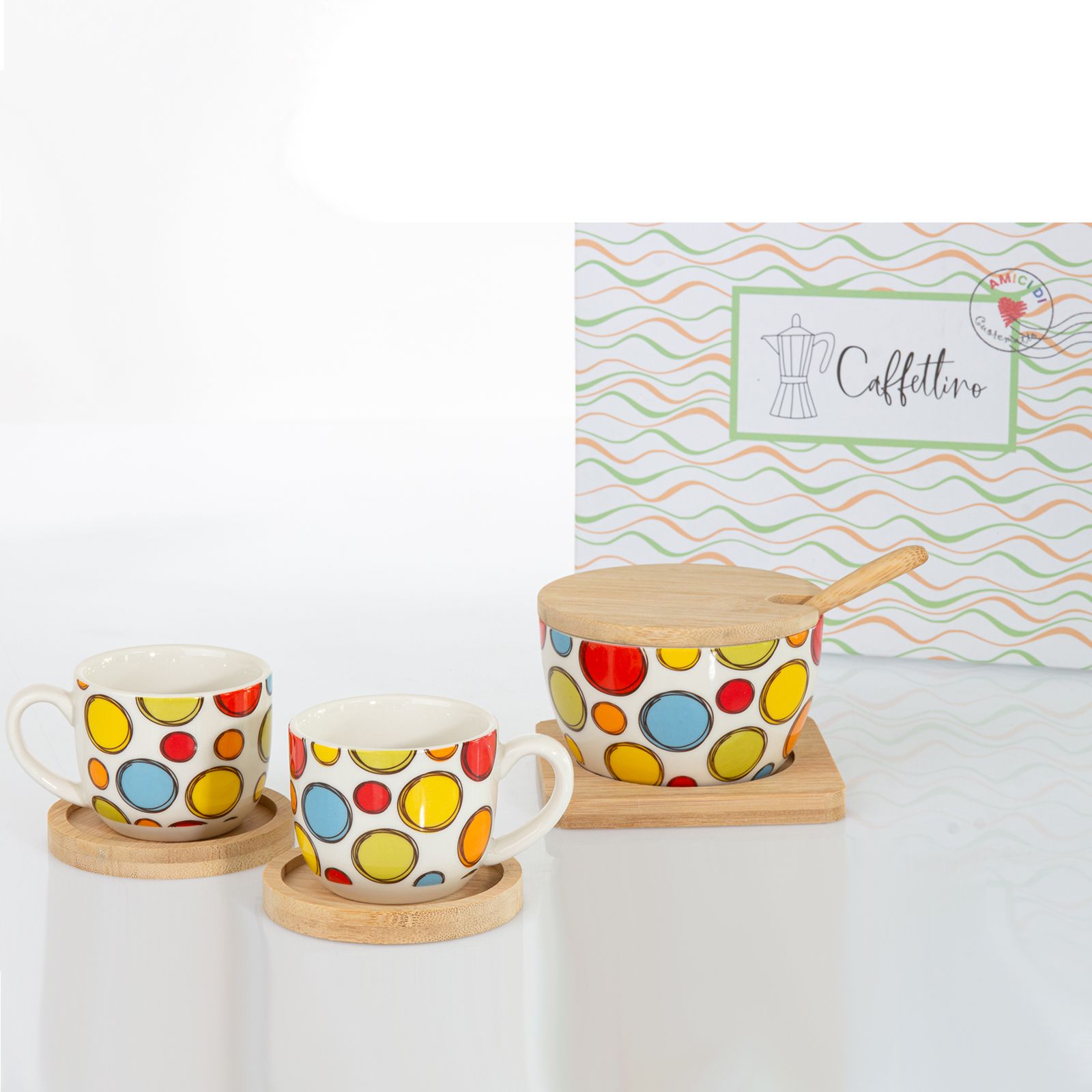 Disponibili per te questi set composti da zuccheriera e tazze in ceramica con piattini, coperchio e cucchiaino in legno naturale. Sia la zuccheriera che le due tazzine sono decorate con una fantasia a bolle colorate nelle tonalità del blu, rosso, verde, arancio e giallo su base bianca.