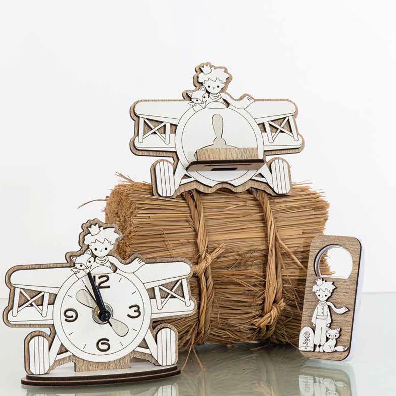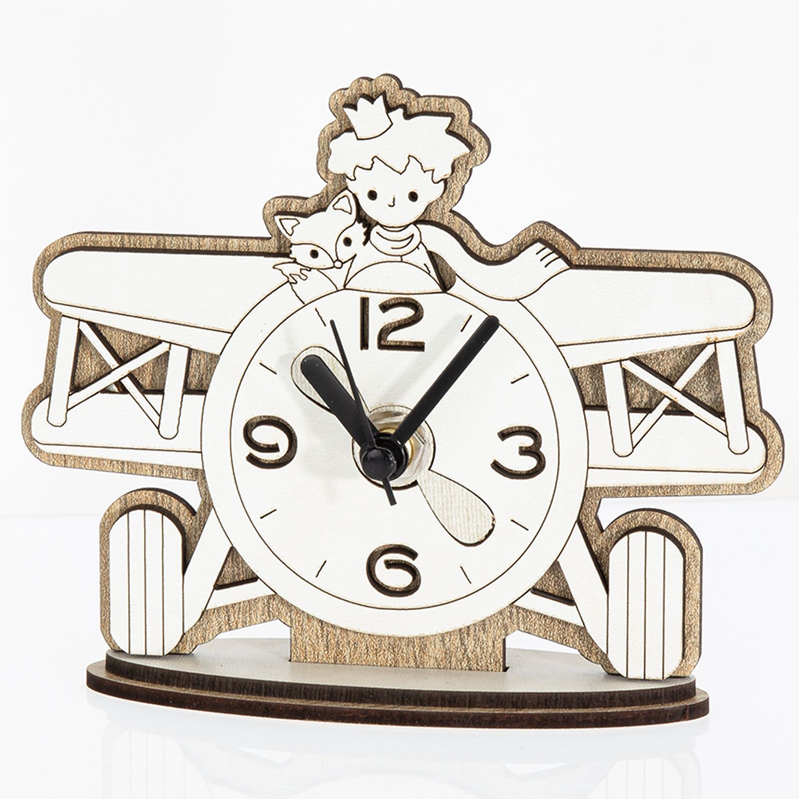 L'Orologio da Tavolo Piccolo Principe è un pezzo d'arte che unisce funzionalità e bellezza. Realizzato con maestria in legno doppio strato, presenta una base in rovere e una superficie bianca che ospita una deliziosa raffigurazione della volpe e del Piccolo Principe indossanti una sciarpa e una corona, entrambi su un aereo.