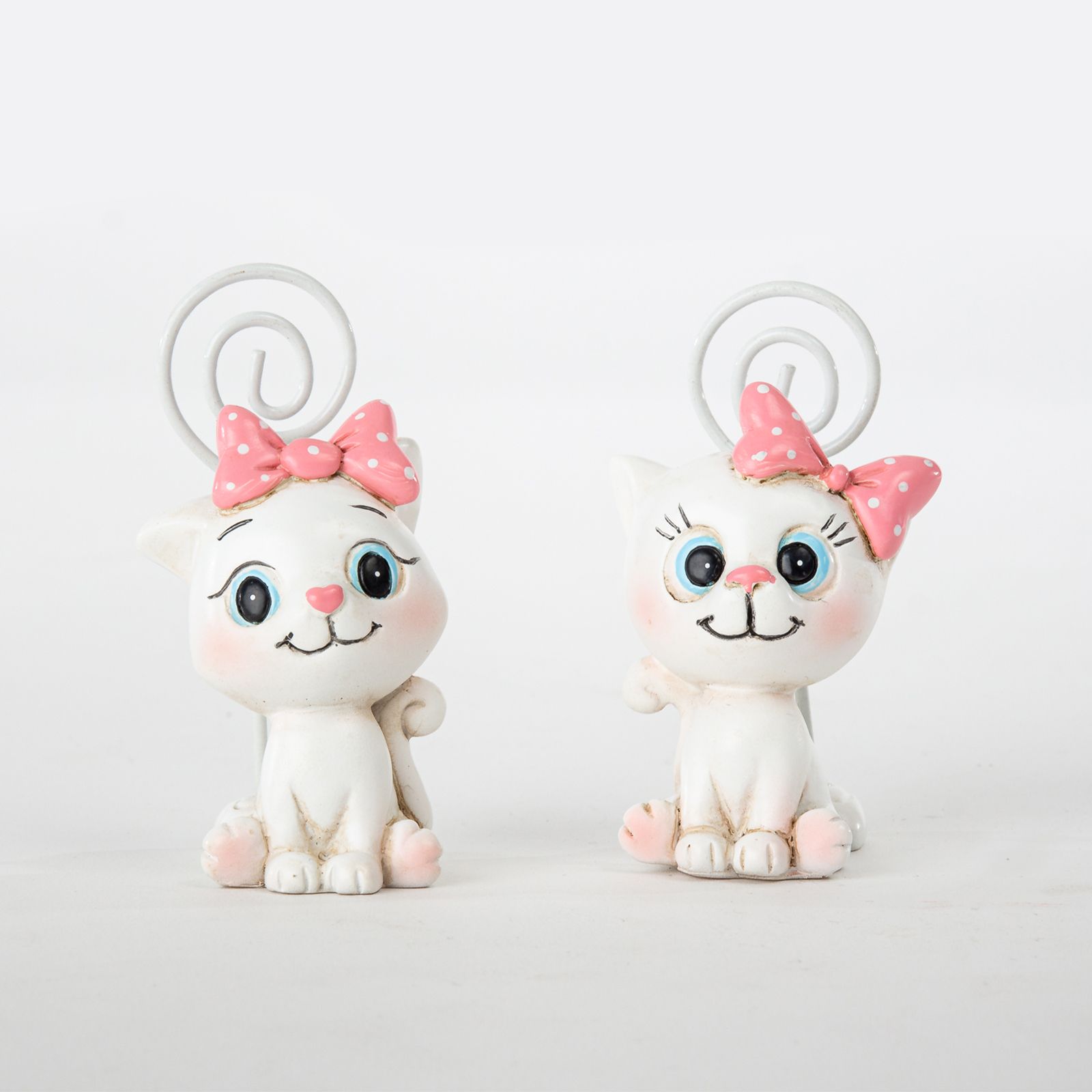 Scopri il memo clip portafoto gattino, un'adorabile bomboniera che unisce dolcezza e utilità. Realizzato in resina, questo grazioso gattino presenta un fiocchetto rosa a pois bianchi, disponibile in due varianti. Sul retro, troverai un'asta in metallo che può essere utilizzata come porta foto o segnaposto.