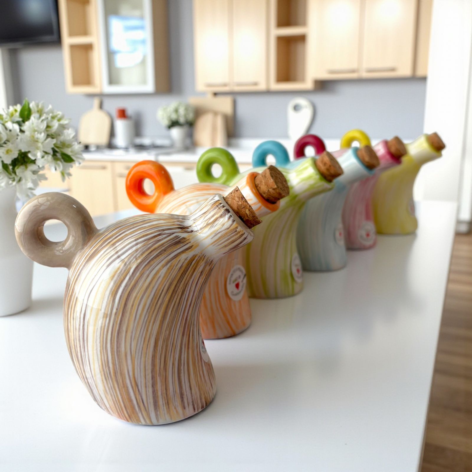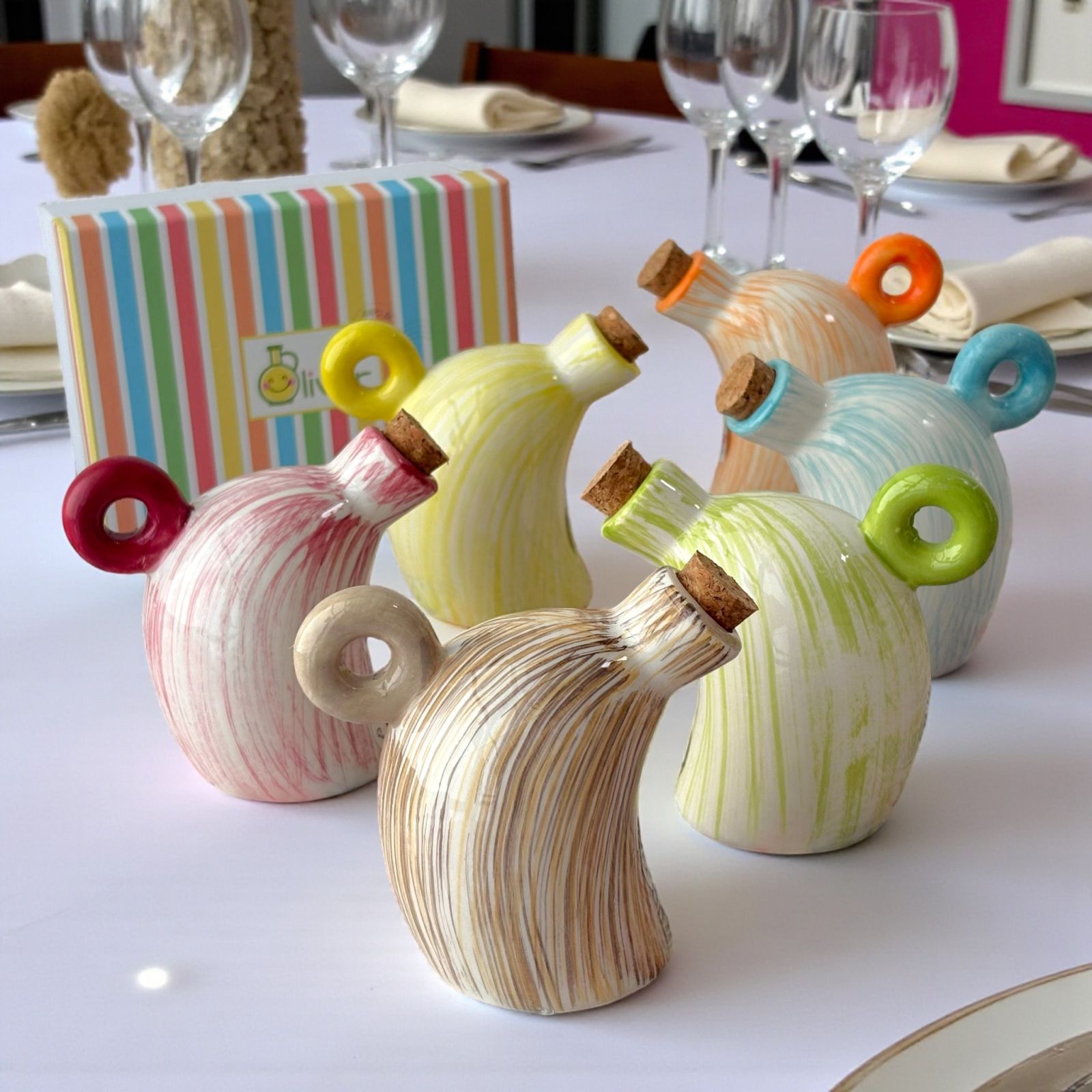 Bomboniere utili ed eleganti con Oliera in ceramica con tappo in sughero. Un'idea regalo originale ed economica per Matrimonio, Anniversario, Prima Comunione o Santa Cresima.