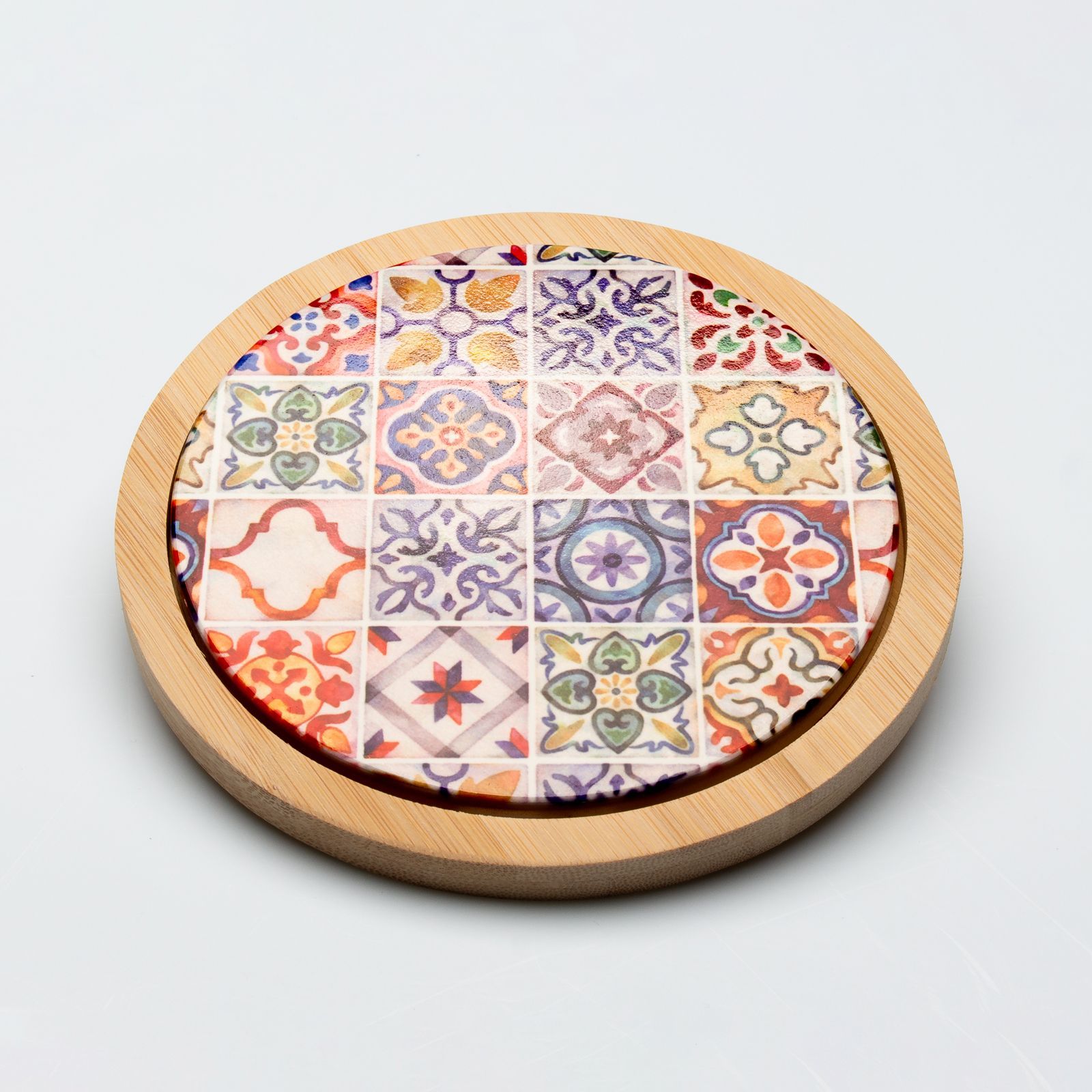 Sottopentola tondo "Linea Sicily" Cuorematto: particolare ed elegante bomboniera, interamente realizzata a mano con materiali di qualità come il bamboo ed una decorazione unica e particolare in ceramica. Questa bomboniera è perfetta per matrimoni ed anniversari. Un idea regalo originale ed economica che renderà uniche ed indimenticabili le vostre bomboniere.