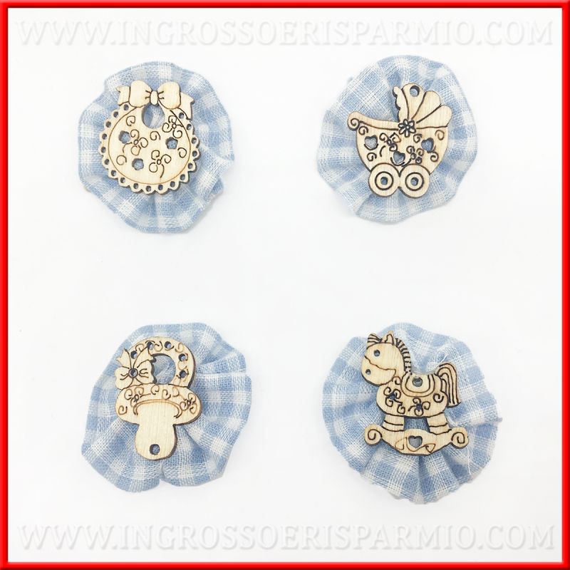 Possibilità di richiedere sacchettini portaconfetti pronti, decorati con queste applicazioni nascita, completi di 5 confetti e bigliettini: clicca sul tasto "Personalizza e aggiungi al carrello".