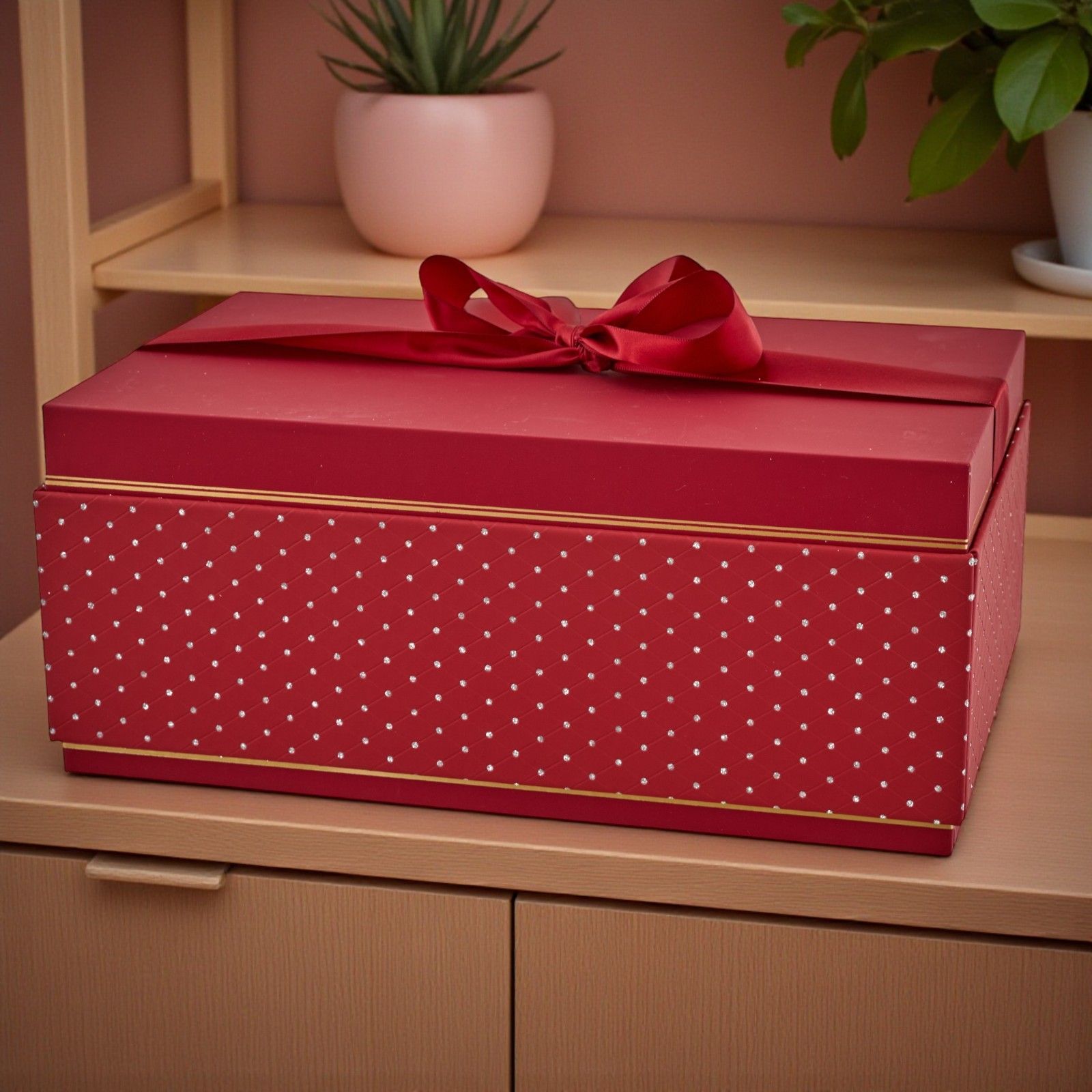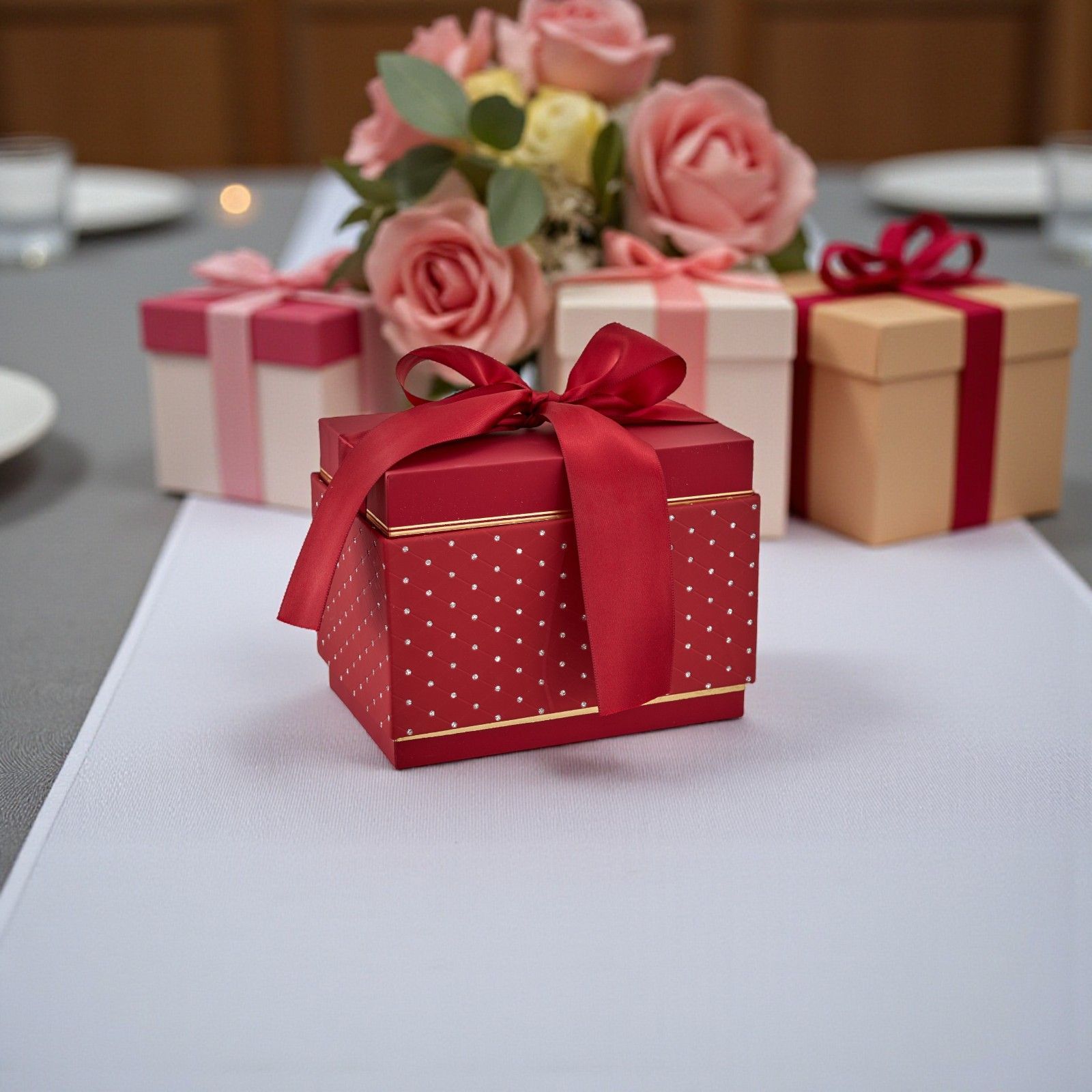 Un magico momento si avvicina e ogni dettaglio conta per rendere l'occasione indimenticabile. La nostra scatola rettangolare rossa è il tocco perfetto per incorniciare i tuoi regali. Con strass scintillanti e dettagli in oro, questa scatola è pensata per sorprendere e incantare, portando un sorriso sul volto di chi la riceve. È l'ideale per matrimoni, anniversari e lauree, un simbolo del tuo affetto e della tua cura.