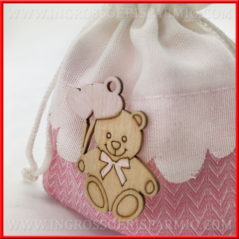 Il ciondolo orsetto è realizzato in legno, color naturale con fiocco e palloncini colorati in rosa; attraverso l'occhiello, potrai applicare semplicemente queste decorazioni bomboniere a sacchetti portaconfetti nascita o battesimo e realizzare l'idea fai da te che preferisci!