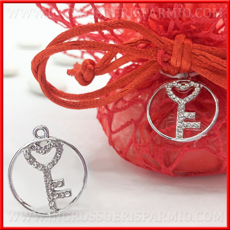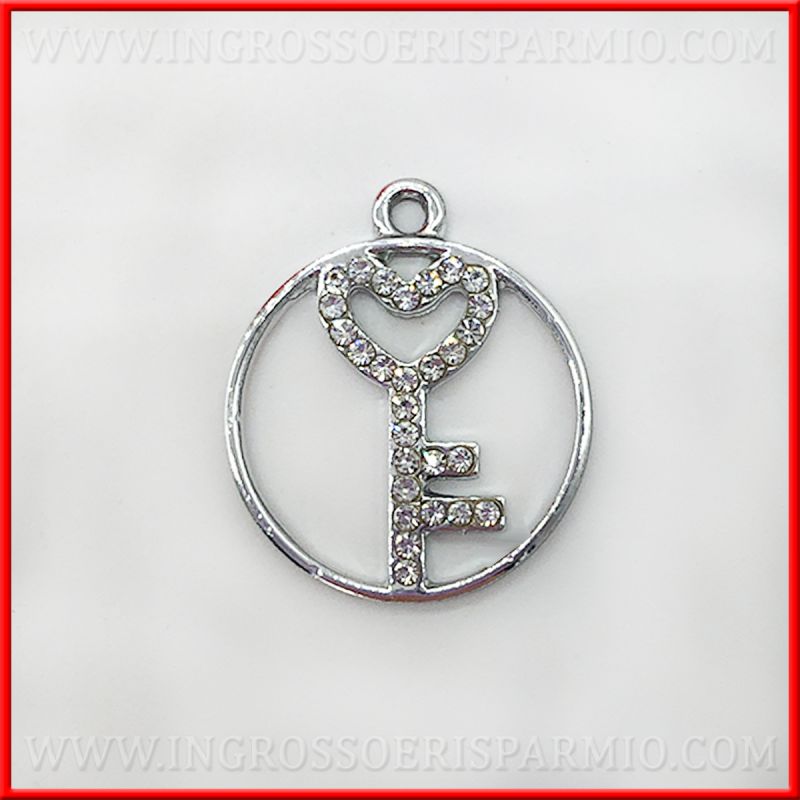 Ciondolo chiave con strass di piccole dimensioni, realizzato in zama, argentato. I ciondoli sono di forma rotonda, con la chiave al centro.