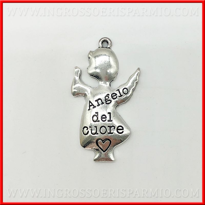 Ciondoli in zama, metallo color argento, a forma di angelo custode con incisione "Angelo del Cuore": idee per bomboniere economiche battesimo, per regalare ad ogni invitato un simbolo porta fortuna, un angelo che li proteggerà sempre.