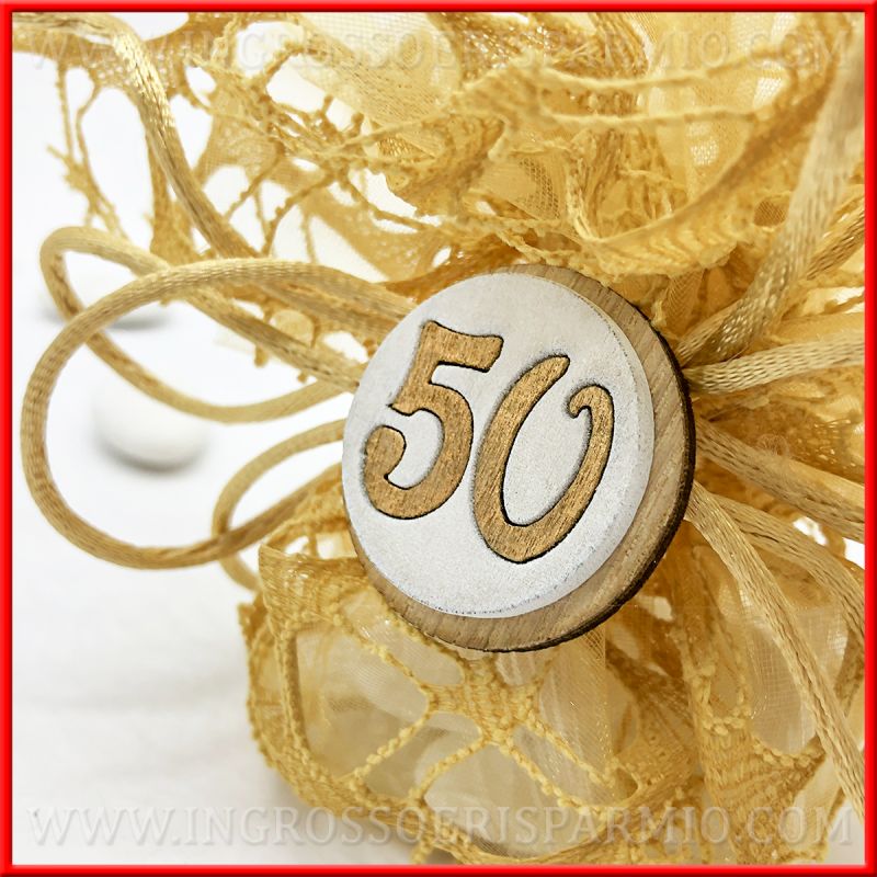 Decorazioni realizzate in legno, simili a medagliette, rotonde formate da due dischi, uno color legno naturale ed uno bianco su cui è riportato il numero 50 color oro.