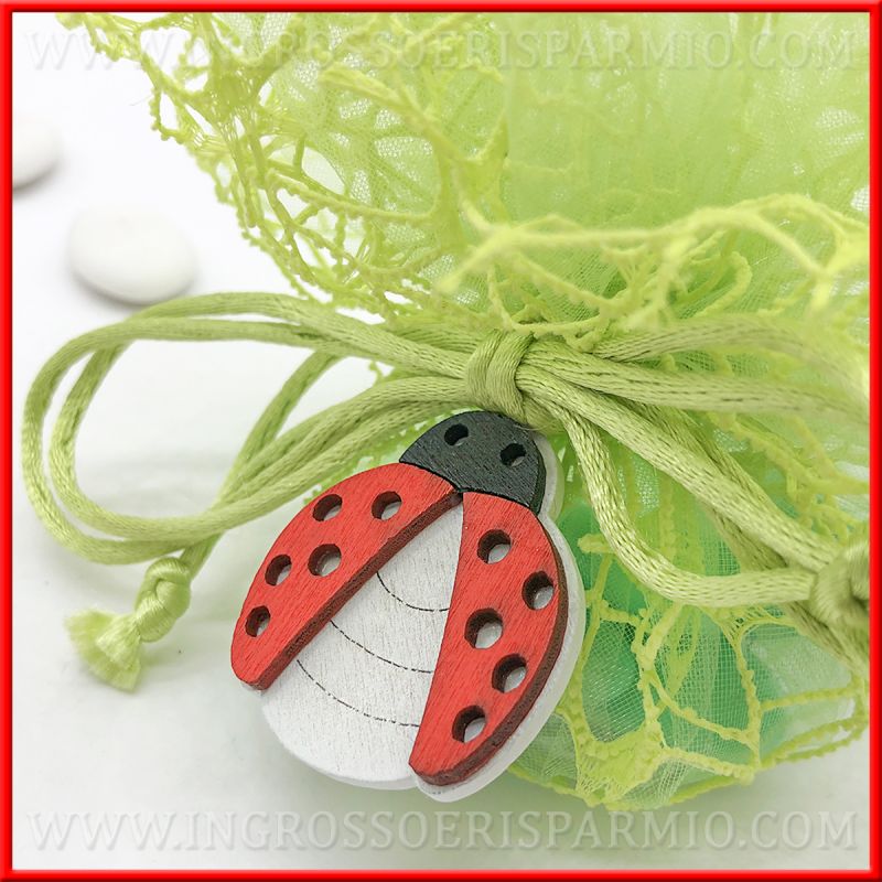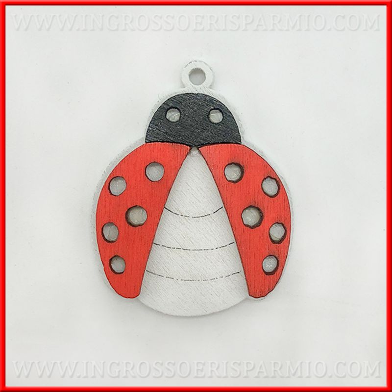 Legnetti coccinella colorati, con ali rosse, testa nera e corpo bianco. Ogni coccinella è fornita di un foro superiore, che consente di utilizzarla come ciondolo e di poterla appendere dove si desidera.