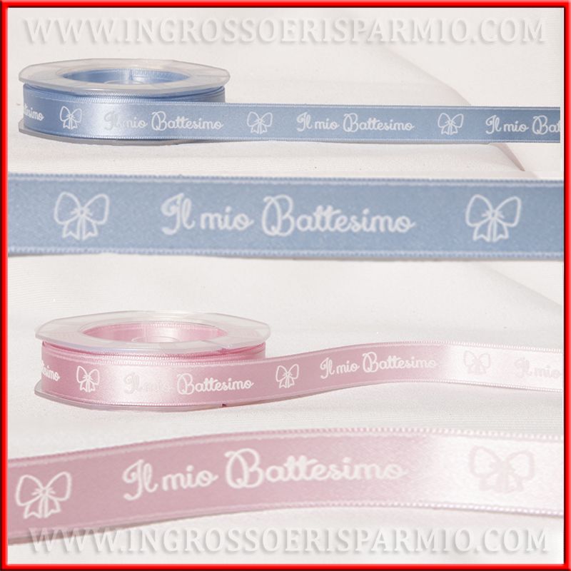 Nastri doppio raso in due varianti di colore, ROSA e CELESTE, lucidi con stampa serigrafica bianca "Il mio Battesimo" in corsivo; la scritta è intervallata da fiocchetti.