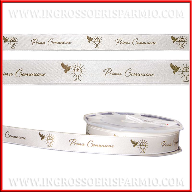 Rocca di nastro bianco in raso con scritta "Prima comunione" realizzata con stampa serigrafica laminata color oro. Il testo, riportato in corsivo, è intervallato dall'immagine del calice con ostia e colomba.