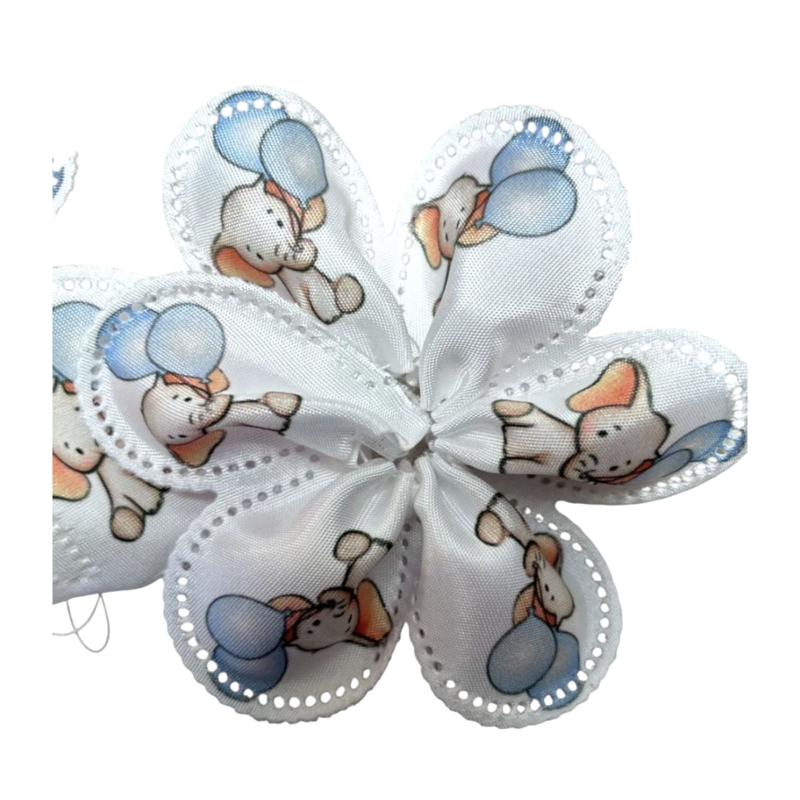 Nastri portaconfetti con stampa digitale: sfondo bianco, in cotone, e stampe di colore celeste o rosa con elefantini e palloncino. Chiusura a fiore, con tiranti.