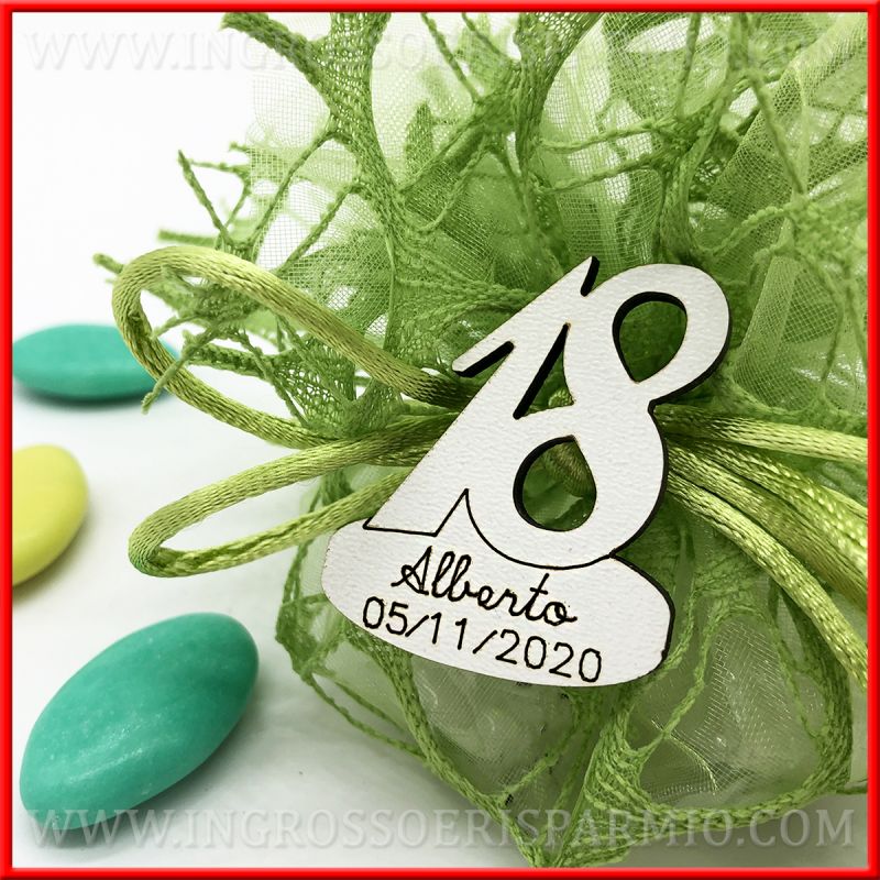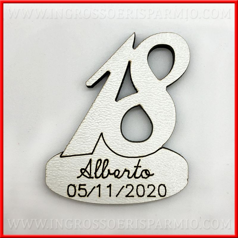 Applicazioni in legno a forma di numero 18 con spazio per incisione: al di sotto del numero diciotto è possibile realizzare UN'INCISIONE PERSONALIZZATA con nome del festeggiato/a e data (oppure "I miei 18 anni + Nome").