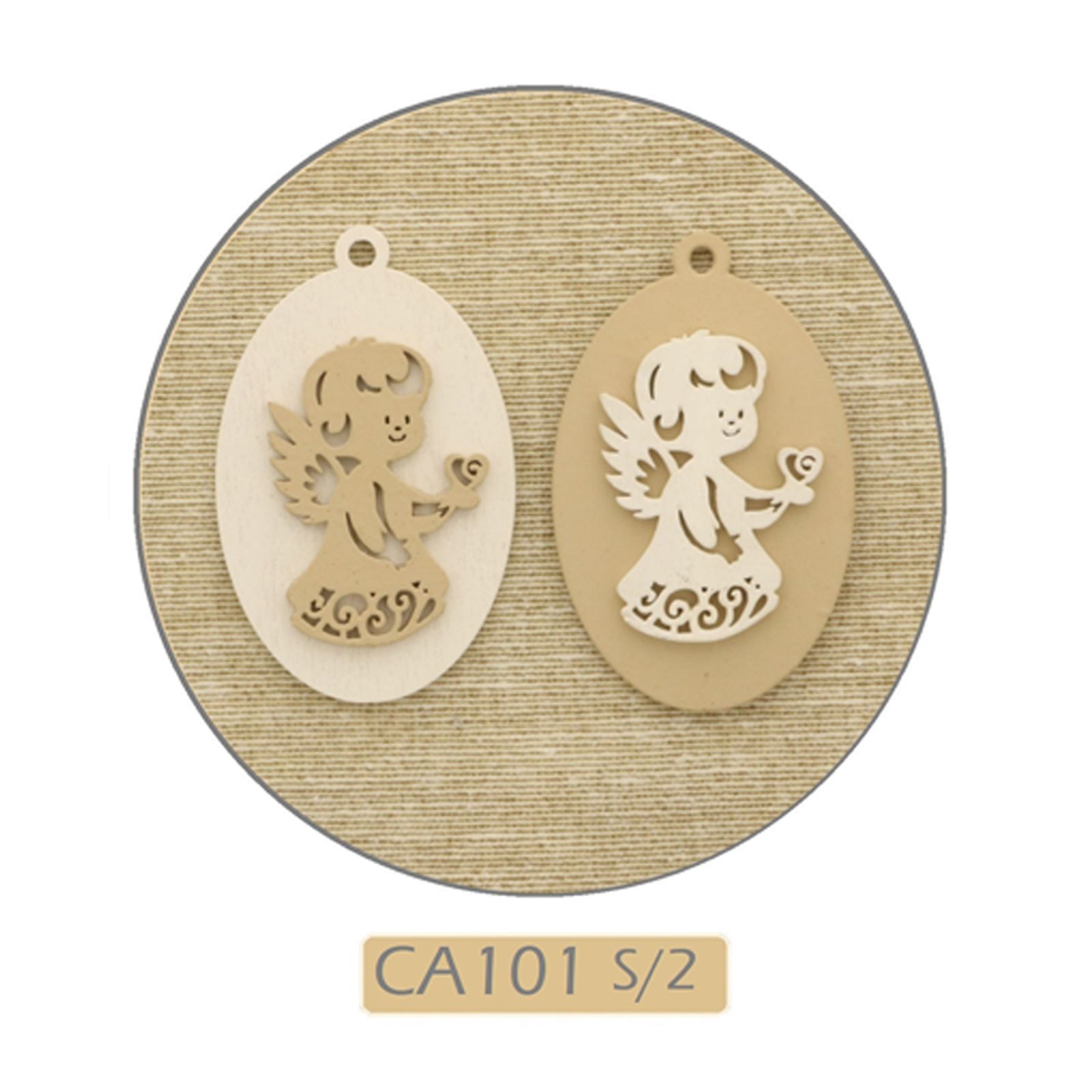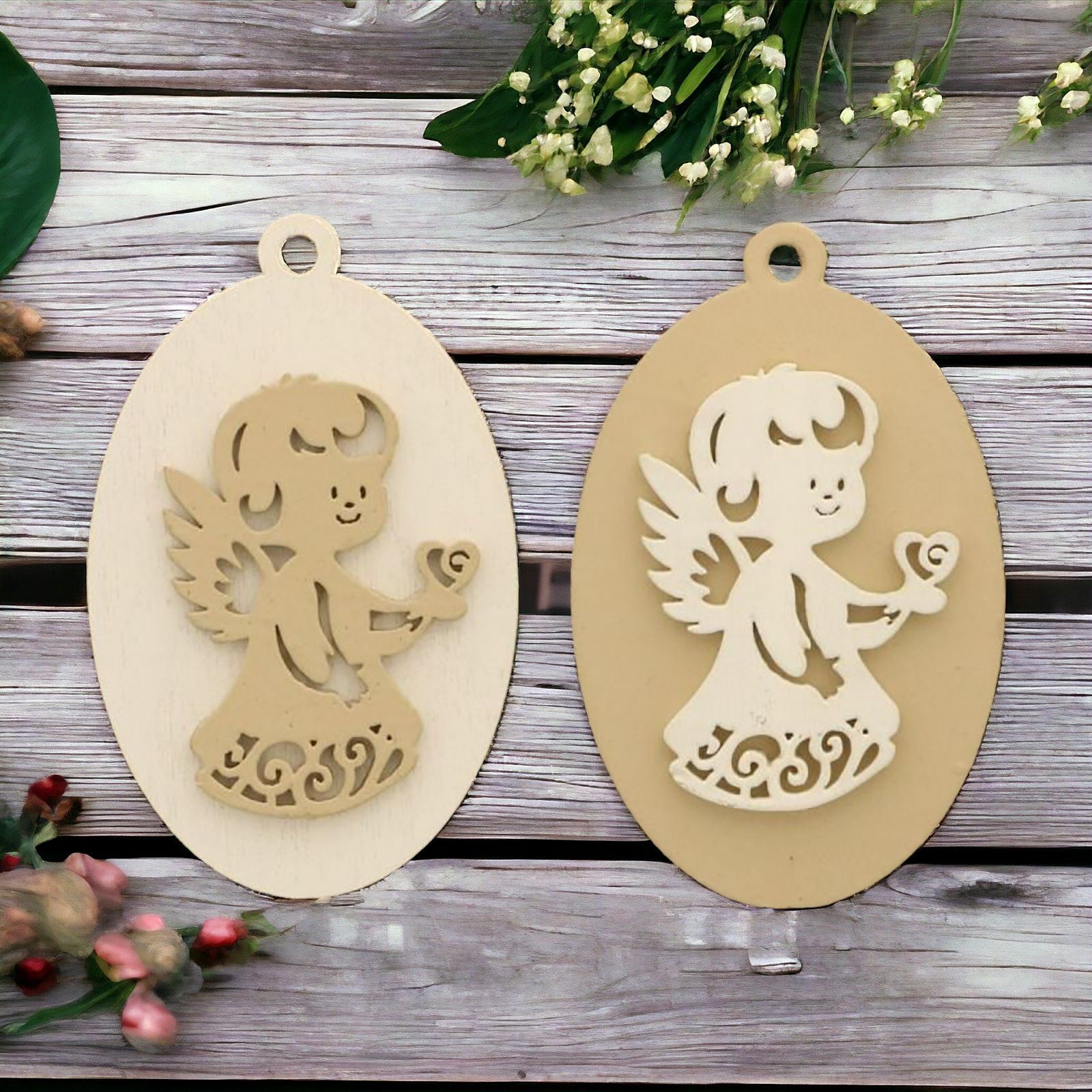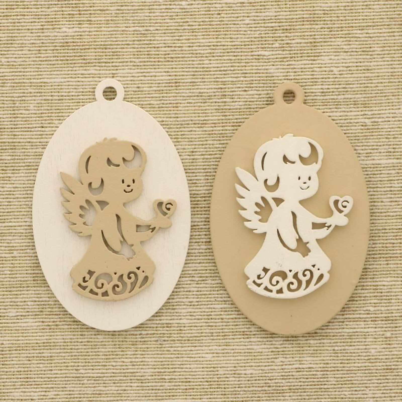 Ad esempio, stai guardando i nostri ciondoli a base ovale in legno che rappresentano un tenero angioletto (anch'esso intagliato in legno) che tiene tra le mani un cuore. Il ciondolo è in due tonalità assortite non acquistabili singolarmente: sfondo bianco e decorazione beige e all'opposto.