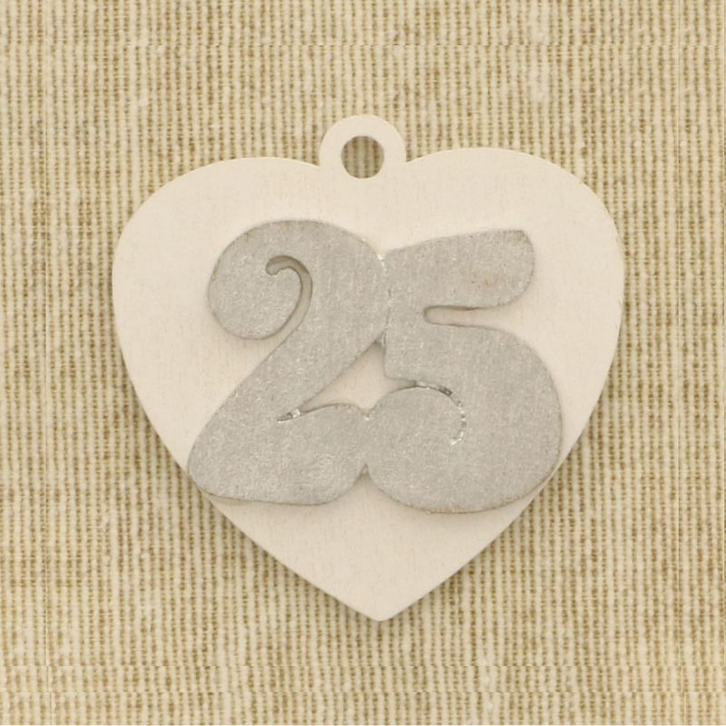 Ti presentiamo i nostri cuori in legno con sovrapposta applicazione dello stesso materiale con il numero 25 in color argento e pratico occhiello per l'inserimento del nastro.