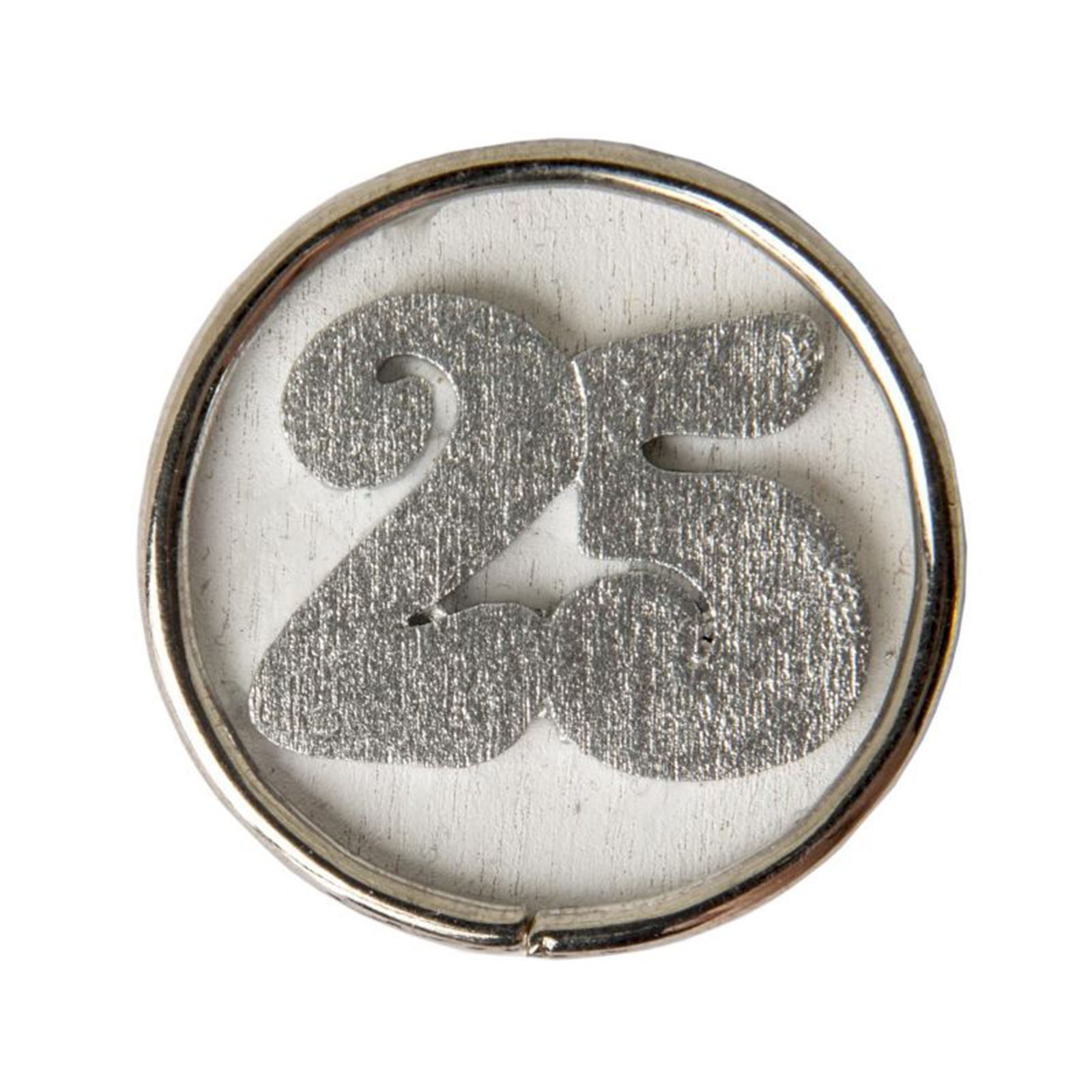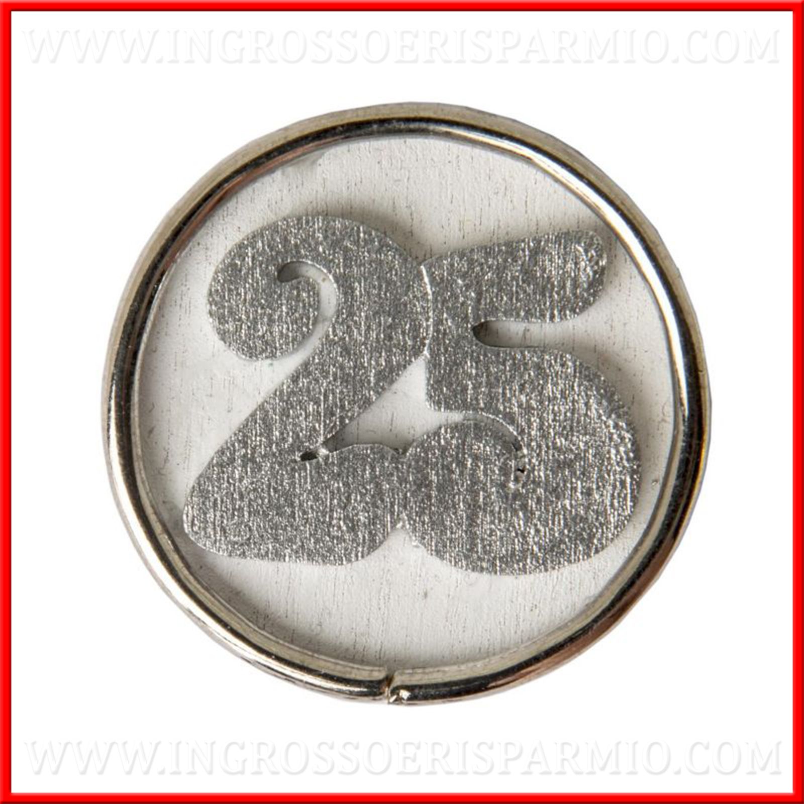 Eccoti accontentato con queste graziose medagliette circolari realizzate in legno di tonalità bianca con applicazione del numero 25 in argento circondato da un anello in metallo.