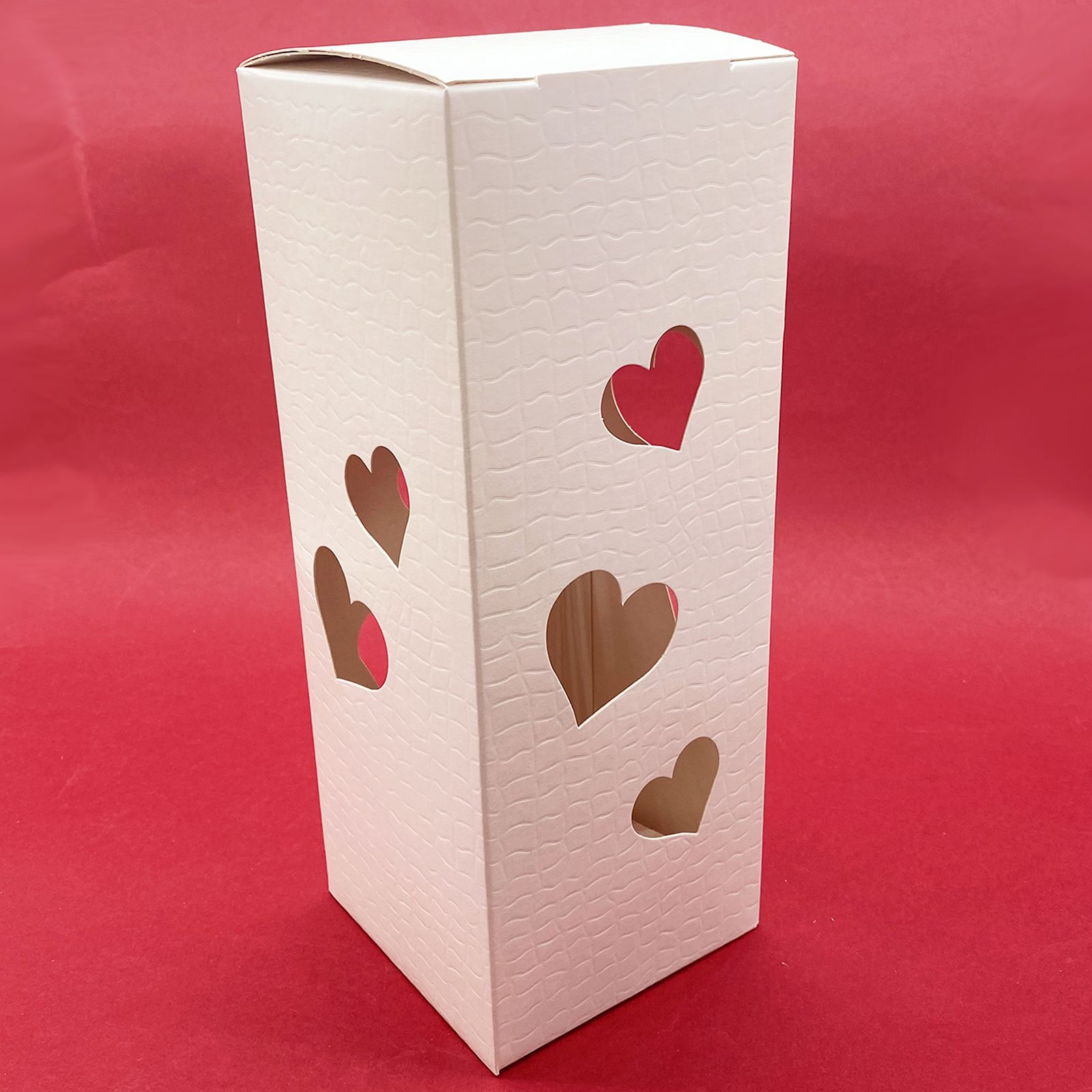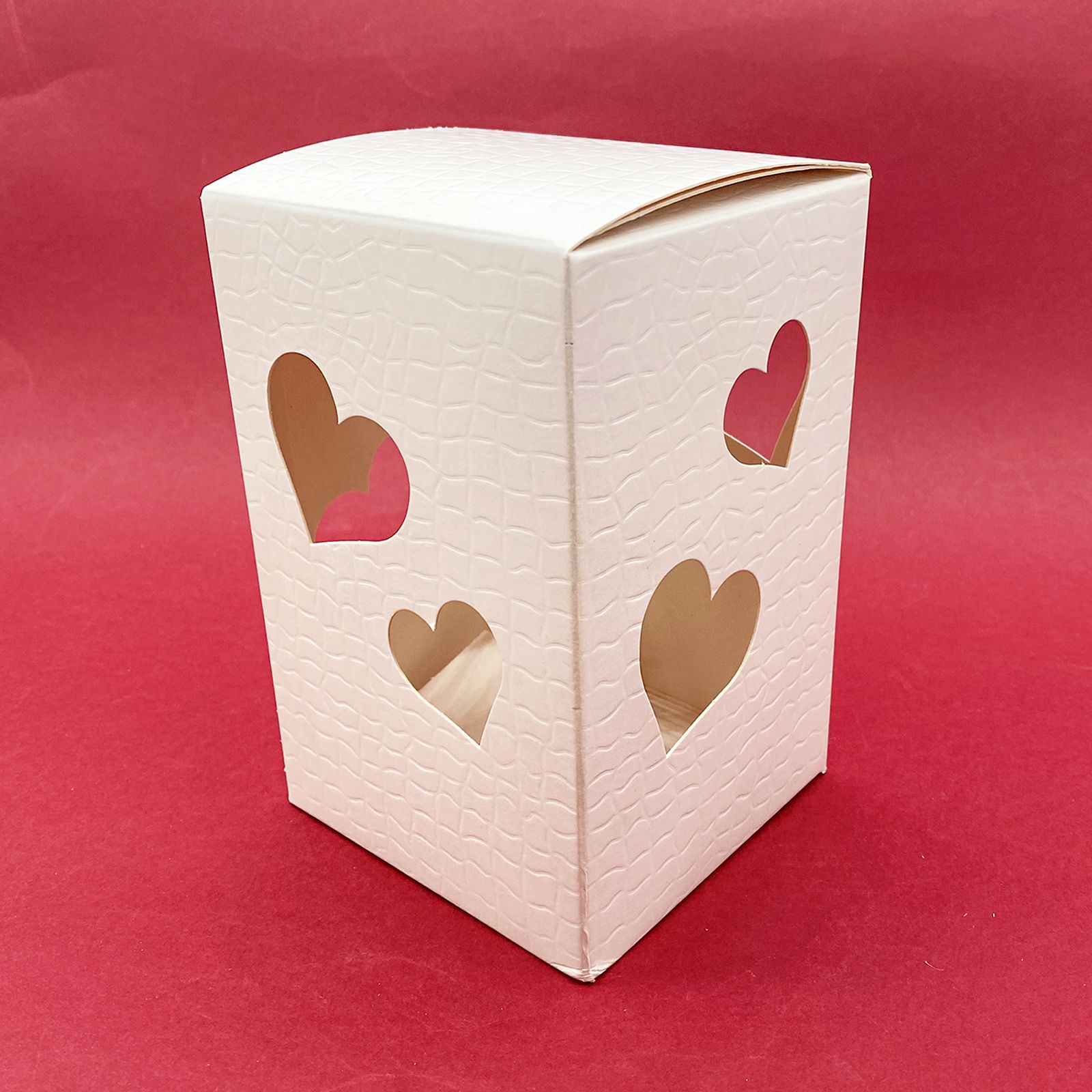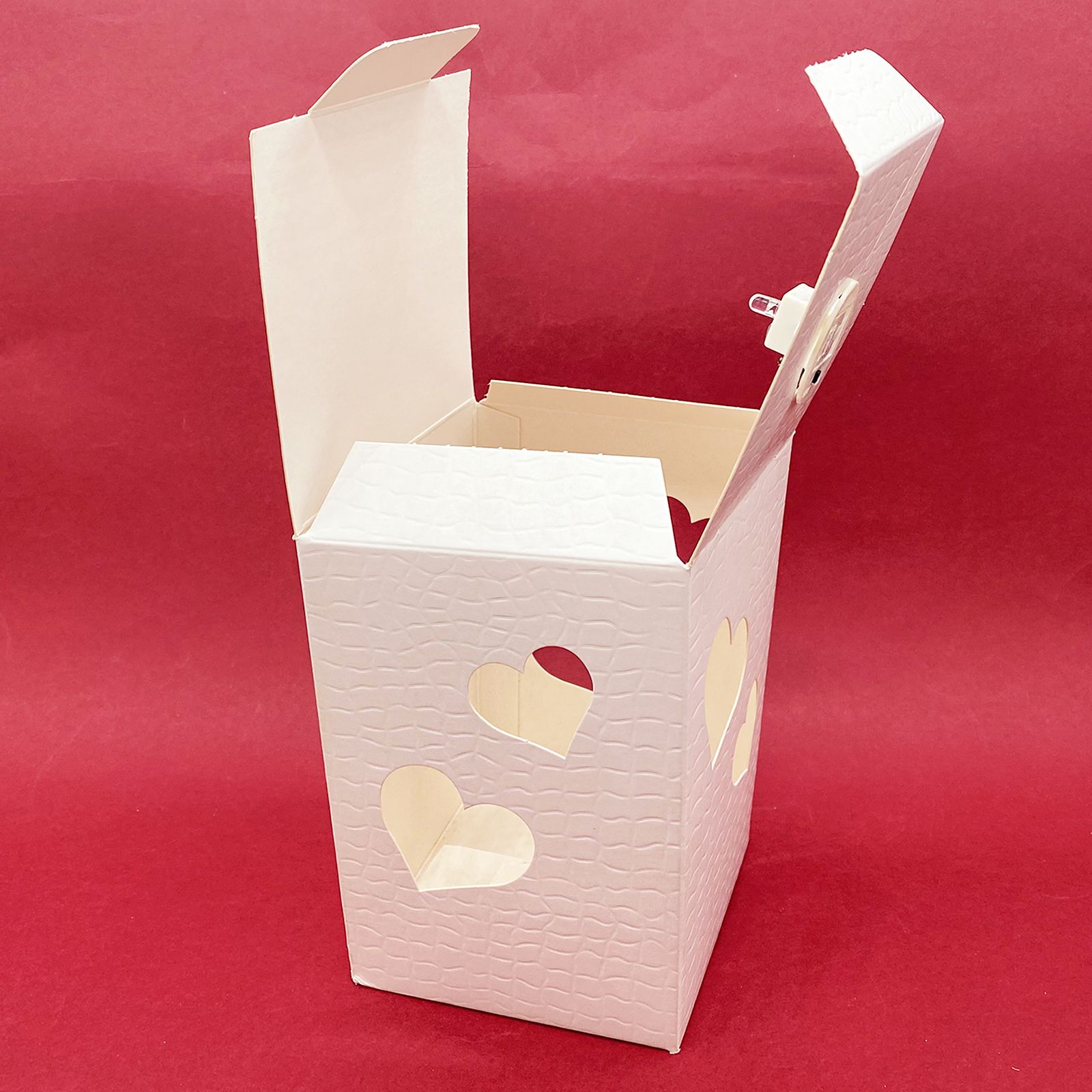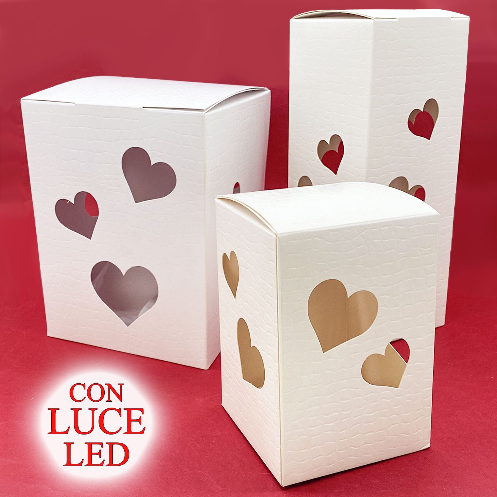 Confeziona le tue bomboniere handmade con le nostre elegantissime scatole bianche traforate in cartone rigido bianco, con trafori a forma di cuore che permettono di vedere l'interno. Le scatole sono realizzate con una particolare tramatura ad effetto plastificato. La peculiarità di queste scatole però, è che sulla parte superiore viene montato un modulo luminoso led a pile (già incluse) che permette alla scatola di diventare una vera e propria lanterna. Una volta acceso, la luce si diffonde all'interno della scatola lasciandone intravedere il contenuto.