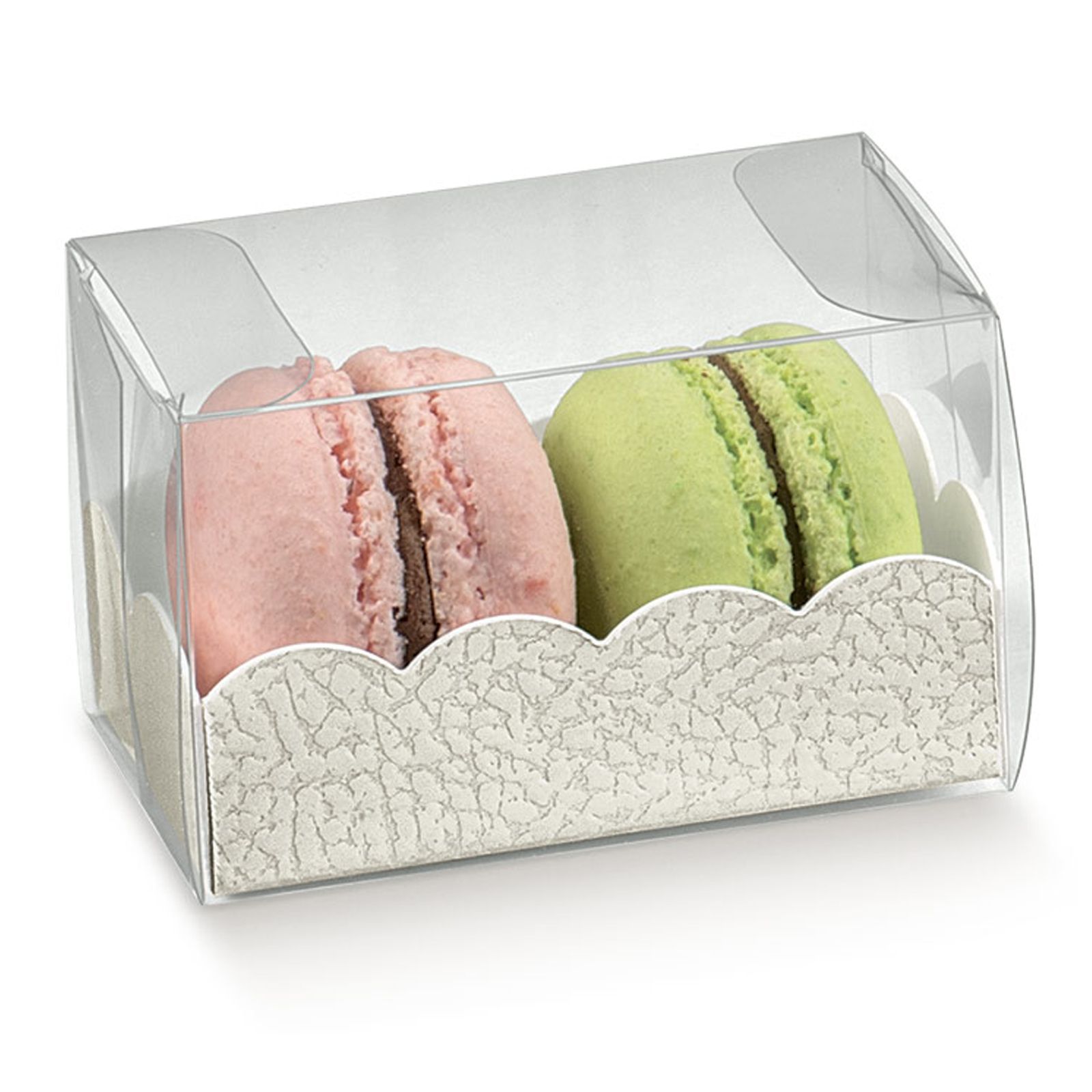 Per te disponibili le nostre scatoline in PVC trasparente con supporto interno in cartoncino per macarons e cioccolatini, che possono ospitare diversi dolcetti contemporaneamente preservandone gusto e consistenza! La trasparenza del pvc permette quindi di vedere ciò che viene inserito all'interno, tutelandolo tuttavia da urti e agenti esterni.