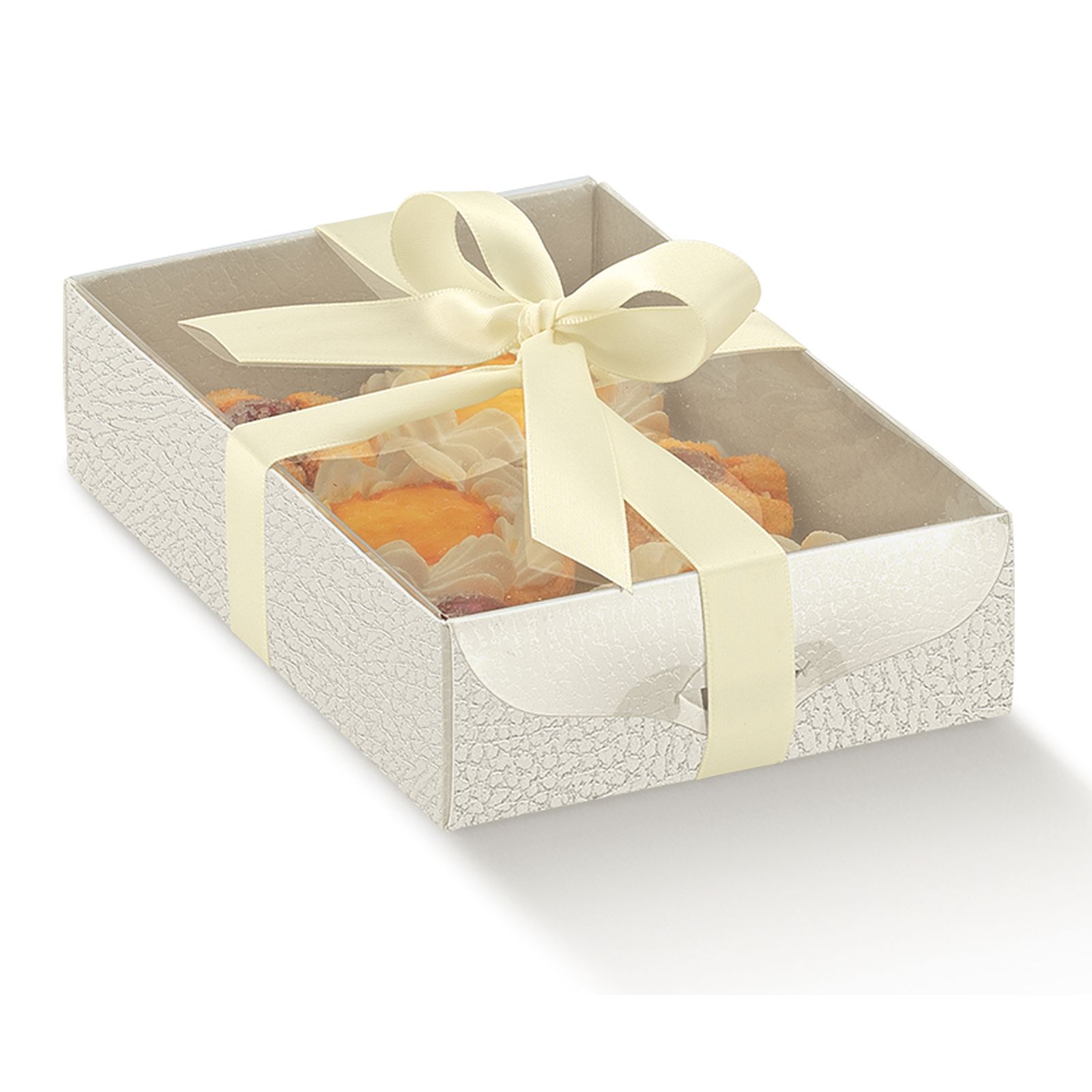 Su ingrossoerisparmio.com puoi acquistare le nostre scatole per alimenti adatte a contenere pasticcini, cioccolatini e biscotti homemade! Le scatole/vassoio sono realizzate con base in cartoncino per alimenti a tramatura damascata e coperchio in pvc trasparente, che si incastra alla base attraverso due lembi che vanno ad inserirsi nelle aperture del cartoncino.