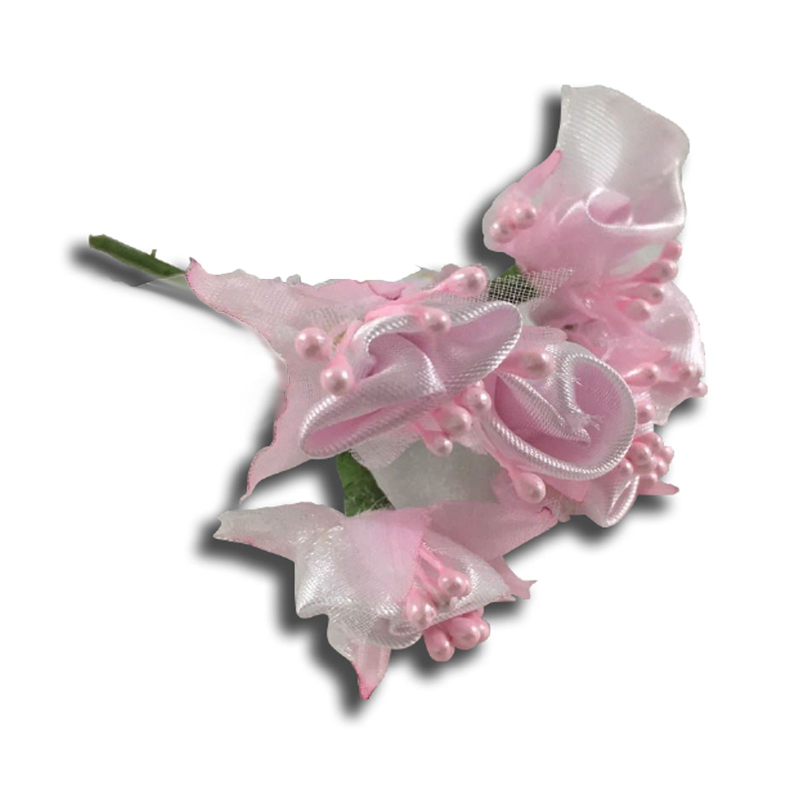 Fiori decorativi in raso e organza con pistilli a forma di perline, il tutto in tonalità rosa con stelo verde in fil di ferro modellabile.