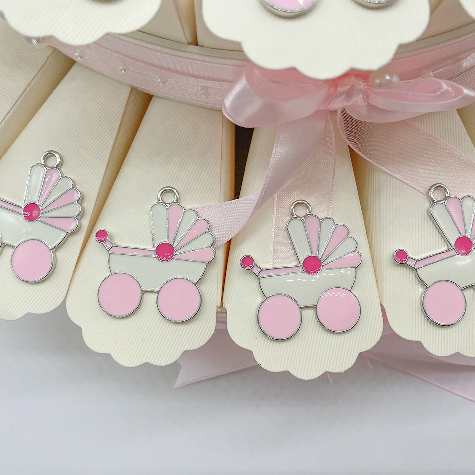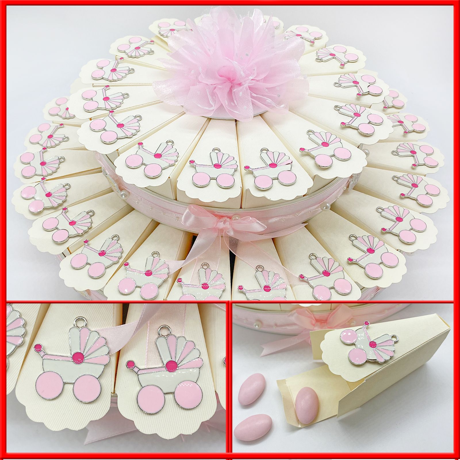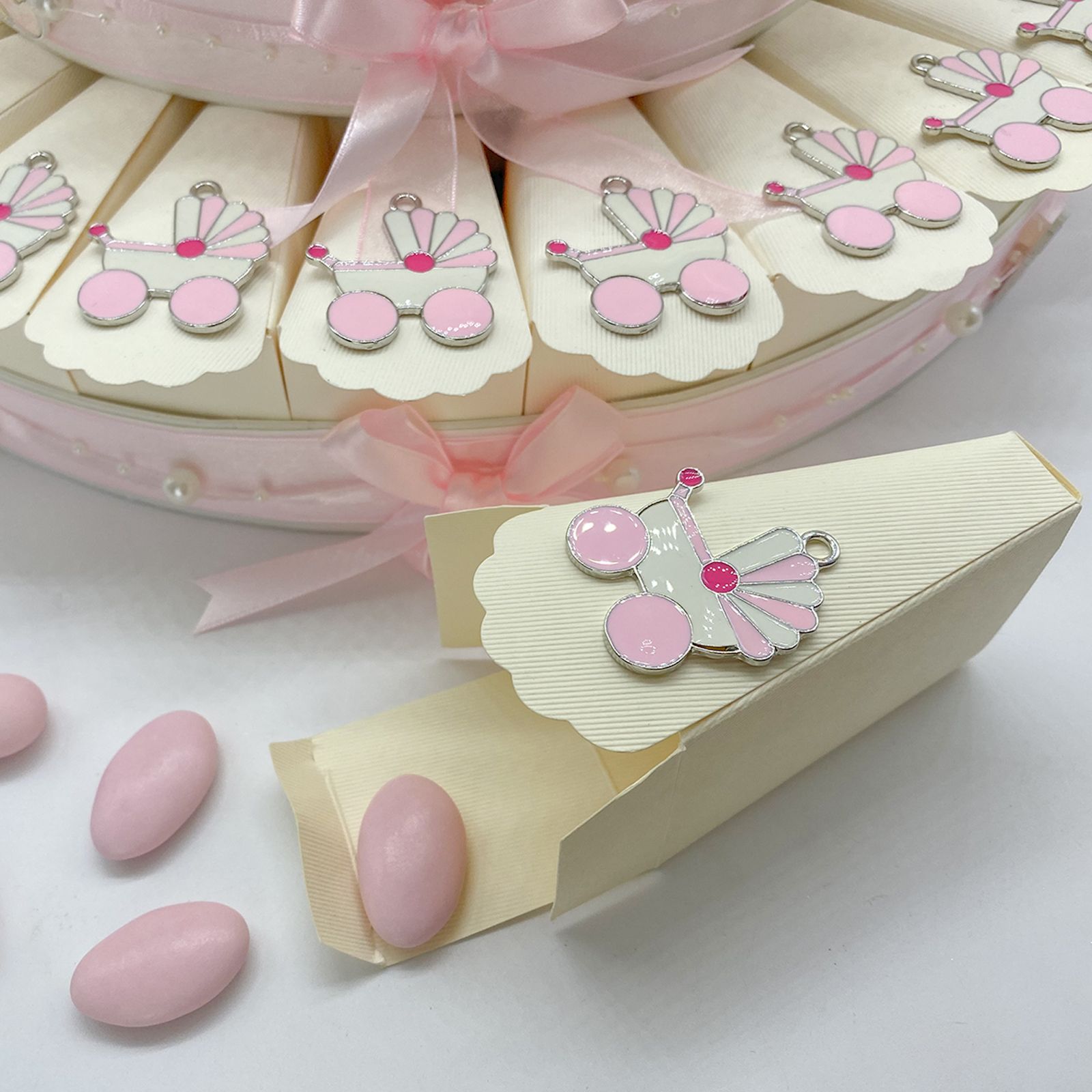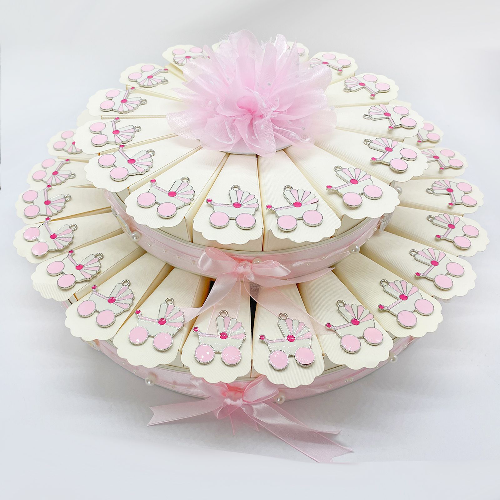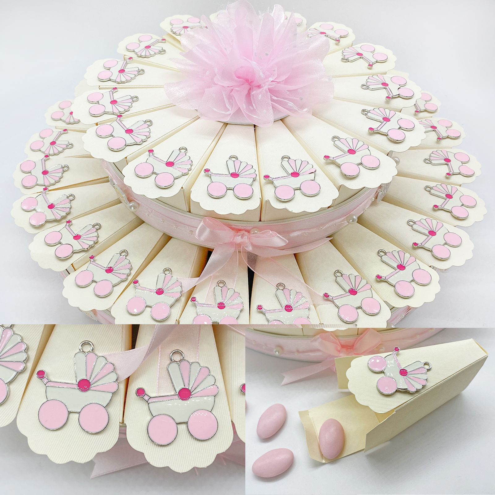 Disponibili per te queste torte di bomboniere con struttura e fette/scatole in cartoncino color avorio, decorate esteriormente con fiocchi, perline e nastrini in rosa. Per ogni fetta, riceverai un ciondolo/charm in zama a forma di carrozzina rosa e bianca. Al centro della torta, troverai un fiore in raso rosa elegante e raffinato.