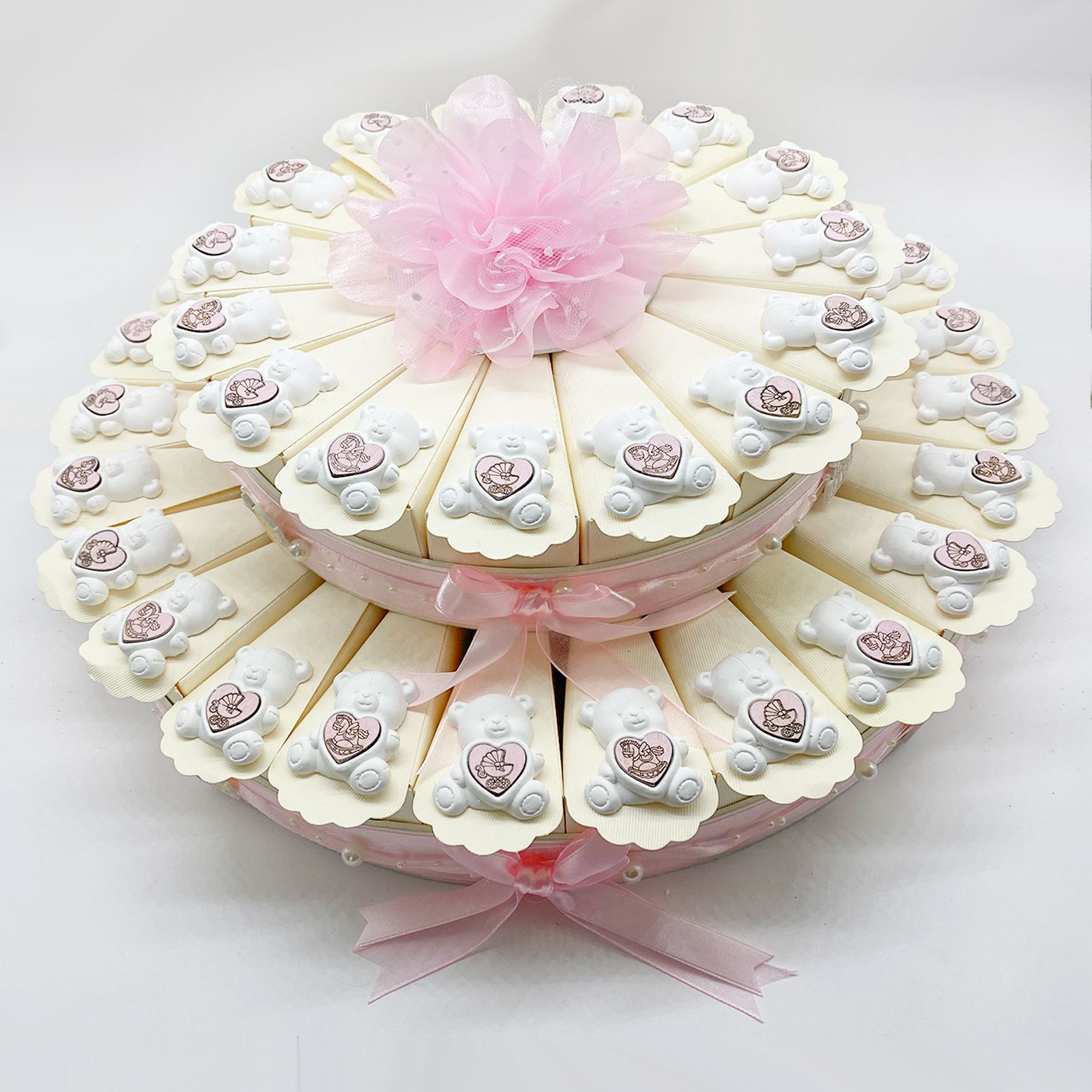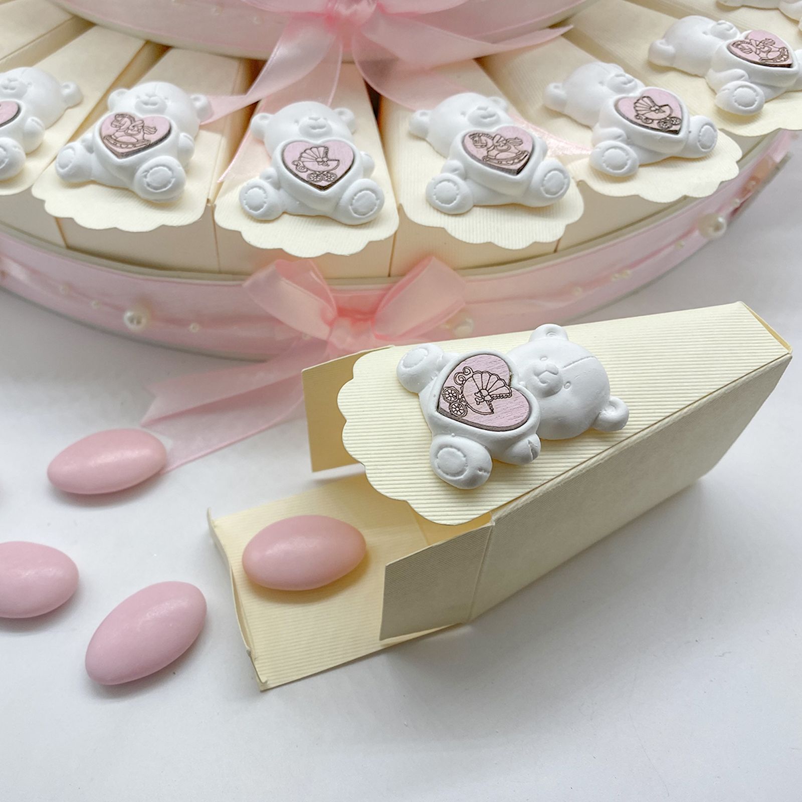 Disponibili per te queste torte di bomboniere con scatole/fette color avorio in cartoncino rigido, decorate all'esterno con fiocchetti, nastrini e perline rosa. Insieme ad ogni fetta, riceverai un gessetto bianco a forma di orsetto con cuore in legno rosa in due varianti assortite, con carrozzina o con cavalluccio. Centralmente, invece, troverai un fiore rosa stilizzato in raso.