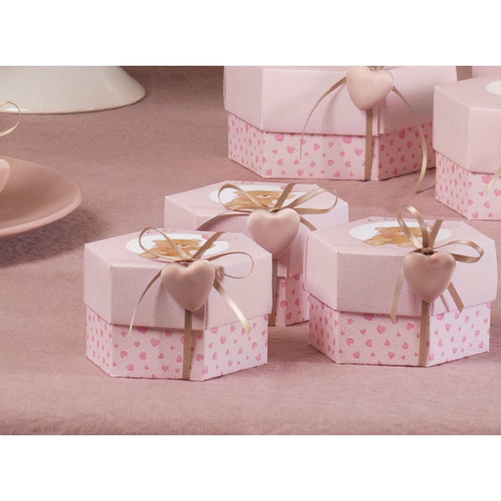 Realizzata con cartoncino rosa decorato con cuoricini fucsia,dalla forma esagonale questa scatola aggiunge un tocco di dolcezza e tenerezza al tuo evento . Il coperchio rosa presenta un adorabile orsetto con un cuoricino e filo, accompagnato dalla scritta "Baby".