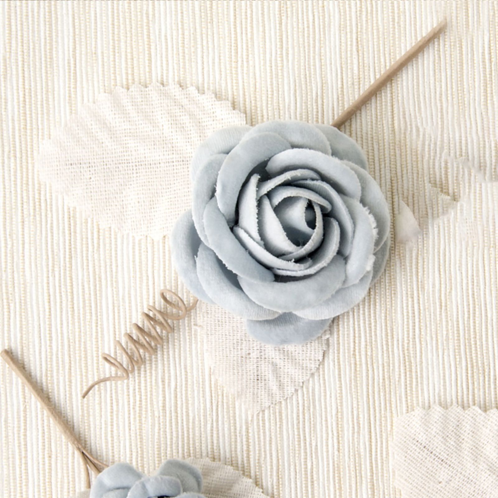 Acquista i migliori fiori finti decorativi online a prezzi convenienti. Questo fiore artificiale in velluto azzurro è perfetto per decorare le tue bomboniere fai da te. È caratterizzato da un ramoscello a spirale e foglie di colore avorio e panna. Adatto per battesimi, matrimoni, comunioni, cresime e altri eventi speciali.