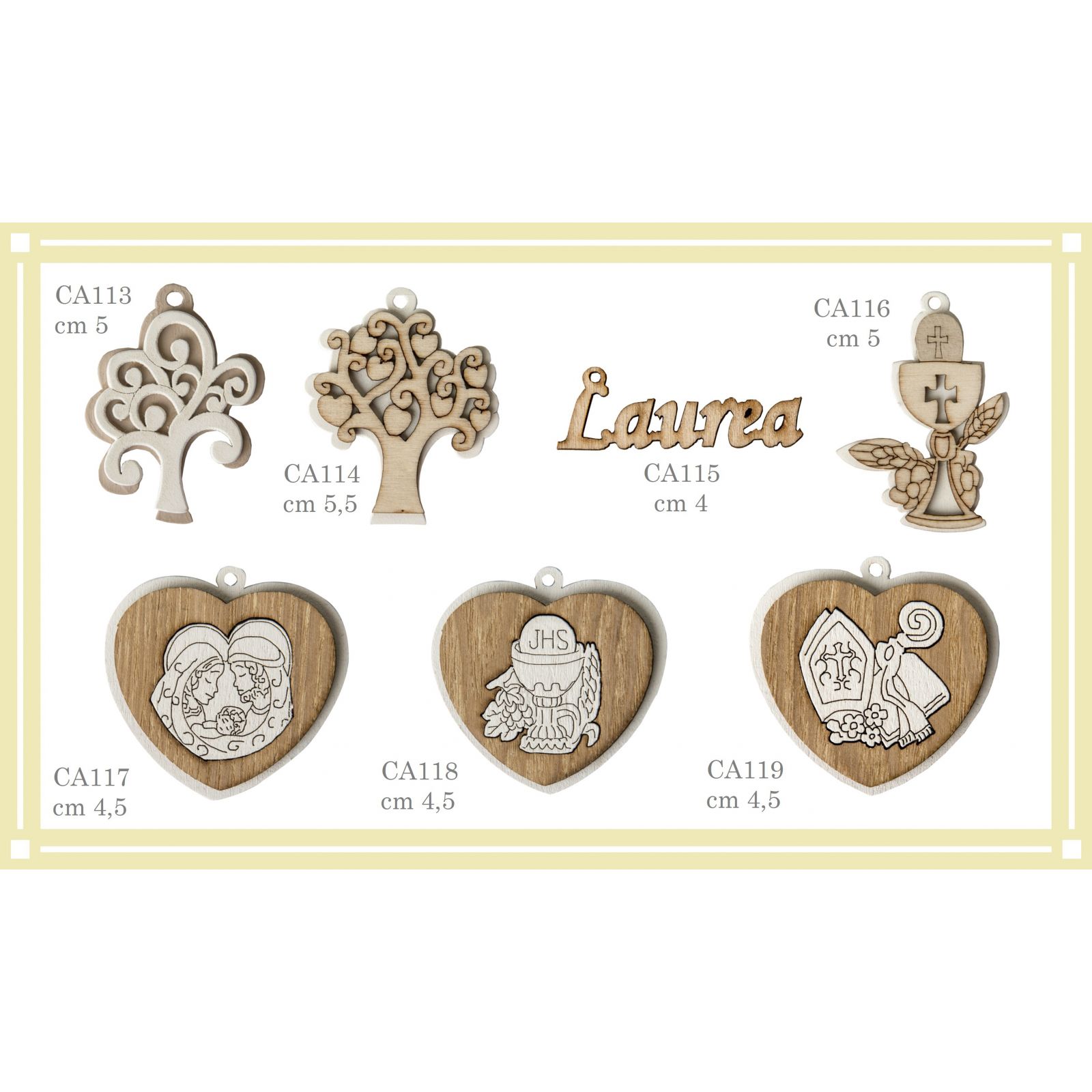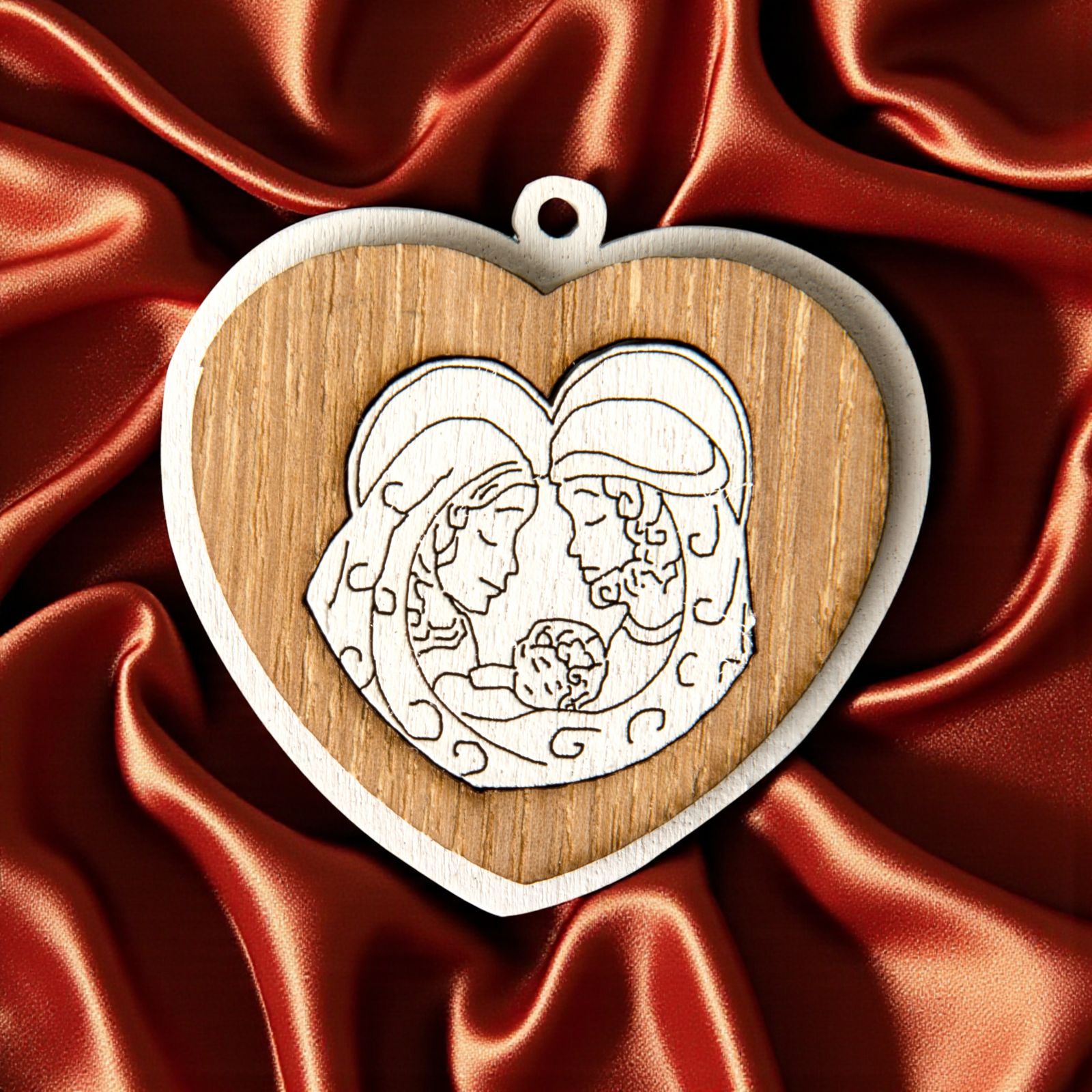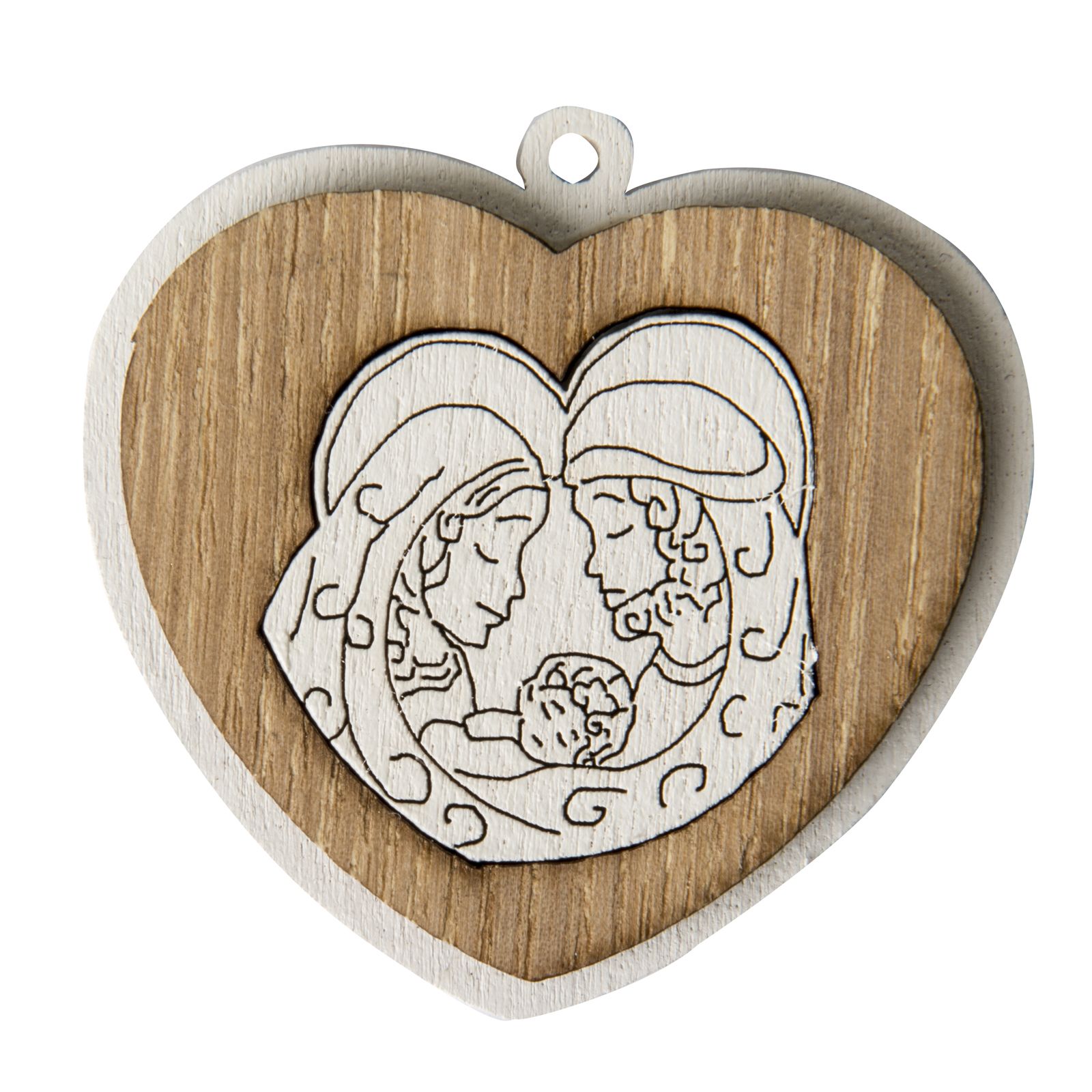 Scopri la nostra splendida applicazione a forma di cuore realizzata con un doppio strato di legno in elegante bianco e color naturale. Al centro del cuore, troverai una Sacra Famiglia stilizzata di colore bianco, simbolo di amore e spiritualità. Completa di un occhiello superiore, questa applicazione può essere utilizzata come un grazioso ciondolo, ideale per decorare le bomboniere.