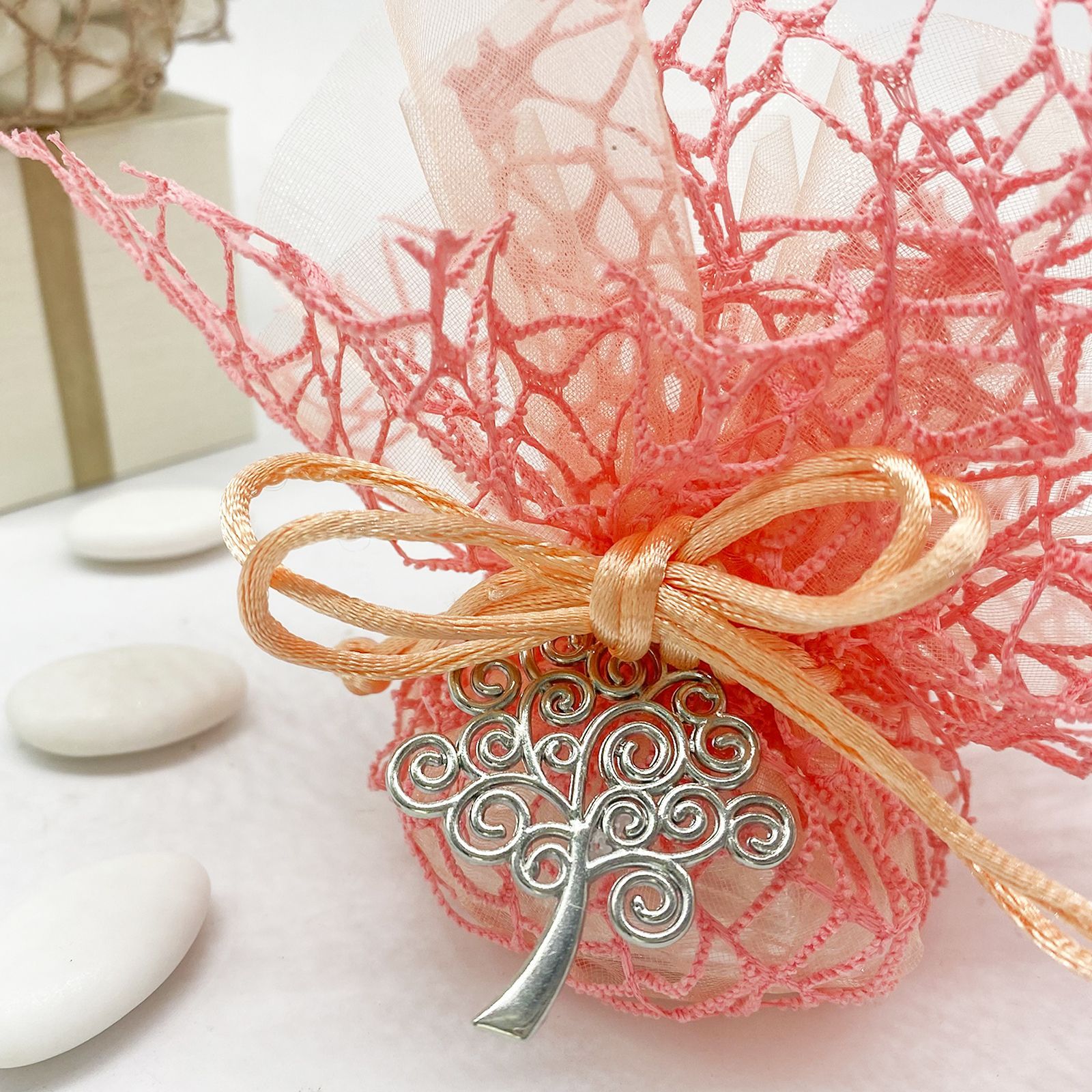 Questa bomboniera è dotata di foglie in zama, che fanno da decorazione al tronco, realizzata con le dimensioni di 4,5 cm circa. Si può trasformare in un ciondolo per una collana, un bracciale o un porta chiavi, ed è possibile usarlo anche come abbellimento per i sacchettini porta confetti, regalando così un tocco di magia al tuo evento speciale.