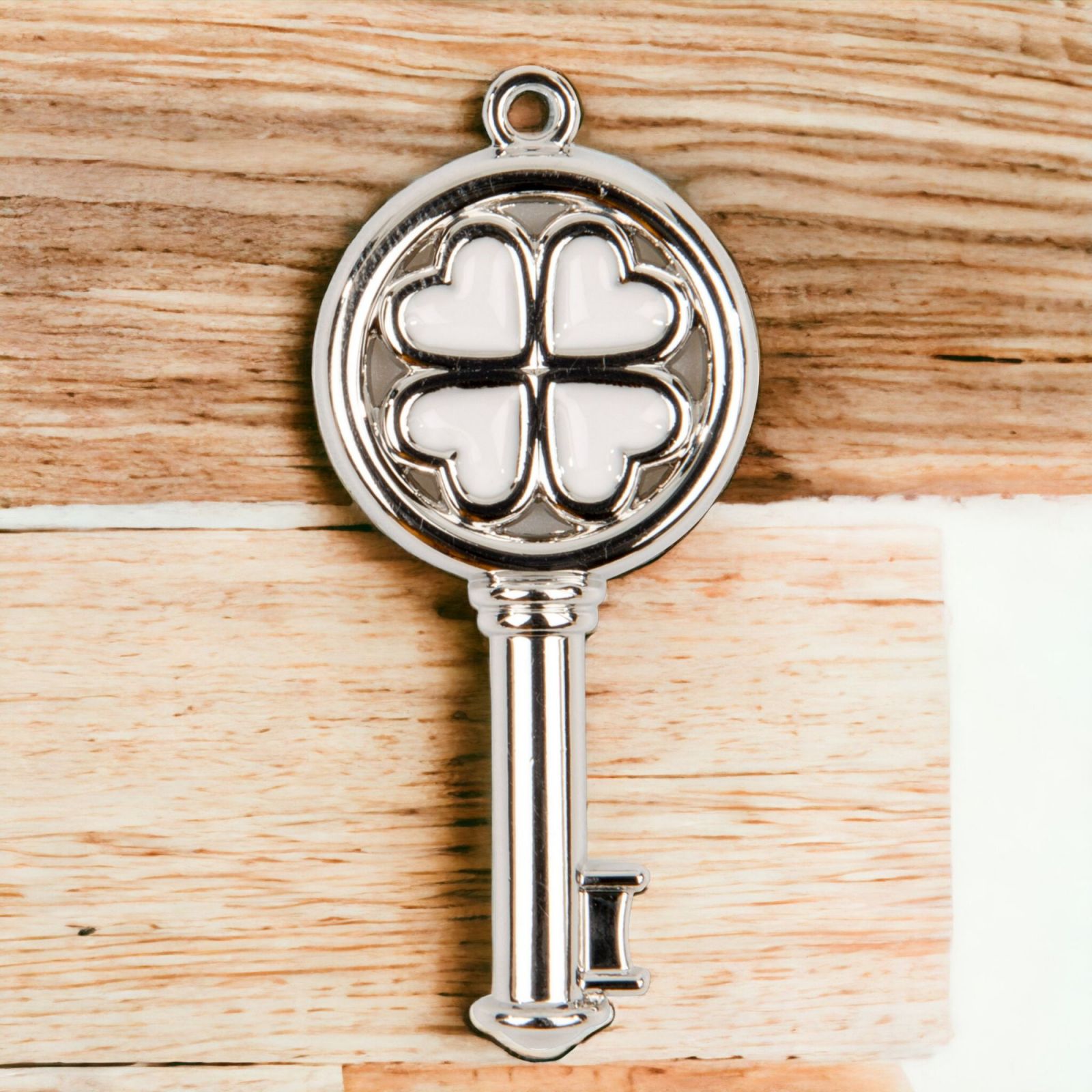 Realizzati in zama con finitura color argento e quadrifoglio bianco, questi ciondolo a forma di chiave sono un simbolo di fortuna e un porta fortuna perfetto per qualsiasi occasione speciale come la laurea, il compleanno, 18 anni o la festa di nozze.