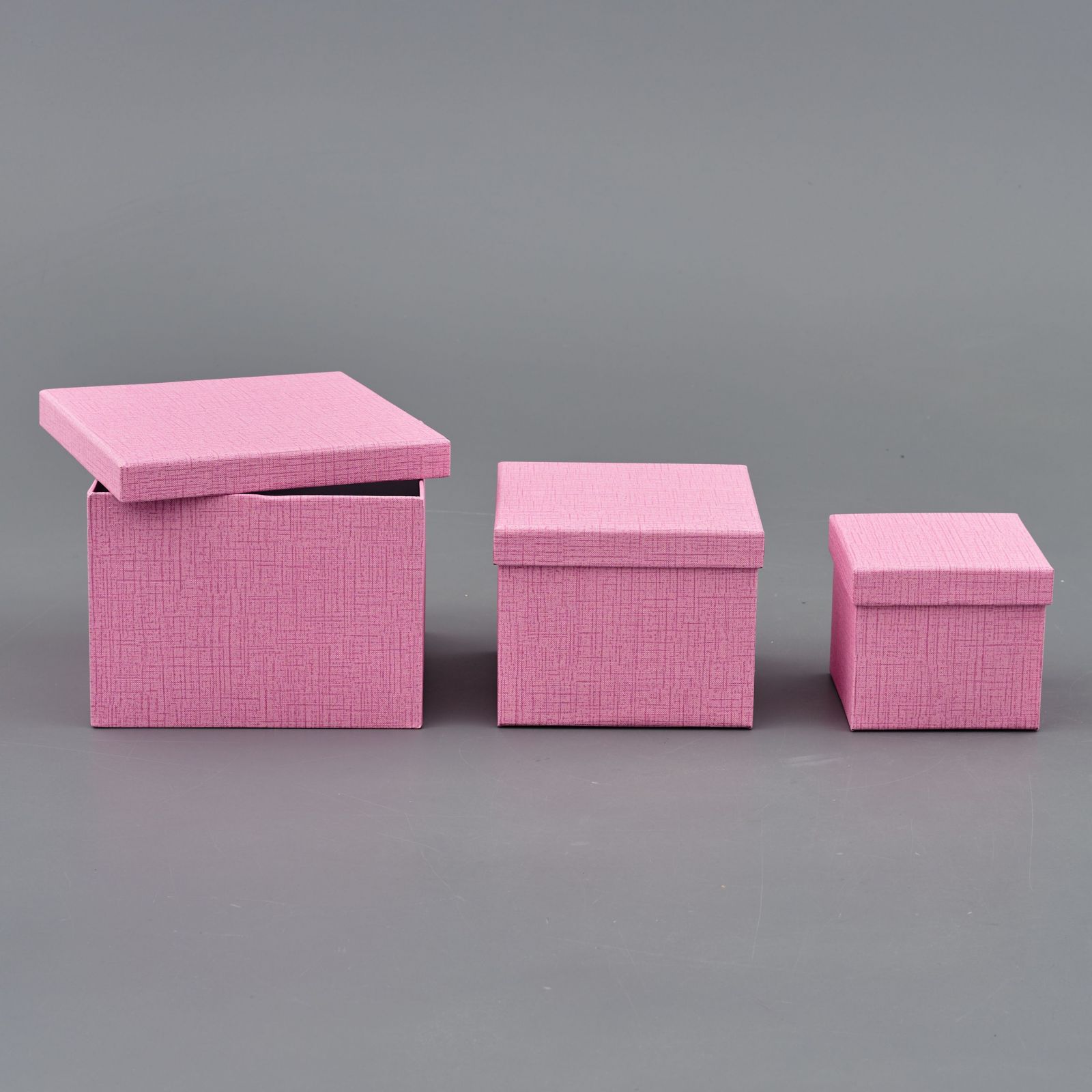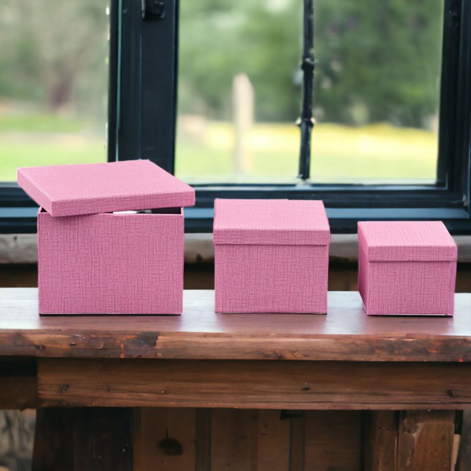 Questo tris di scatole rosa quadrata, è perfetto come confezionamento per le tue bomboniere. Impilabili l'una nell'altra, avrai tre diversi porta oggetti, di diverse dimensioni. Grazie al loro materiale, in cartone rigido, queste scatole saranno ideali per conservare gli oggetti più preziosi.