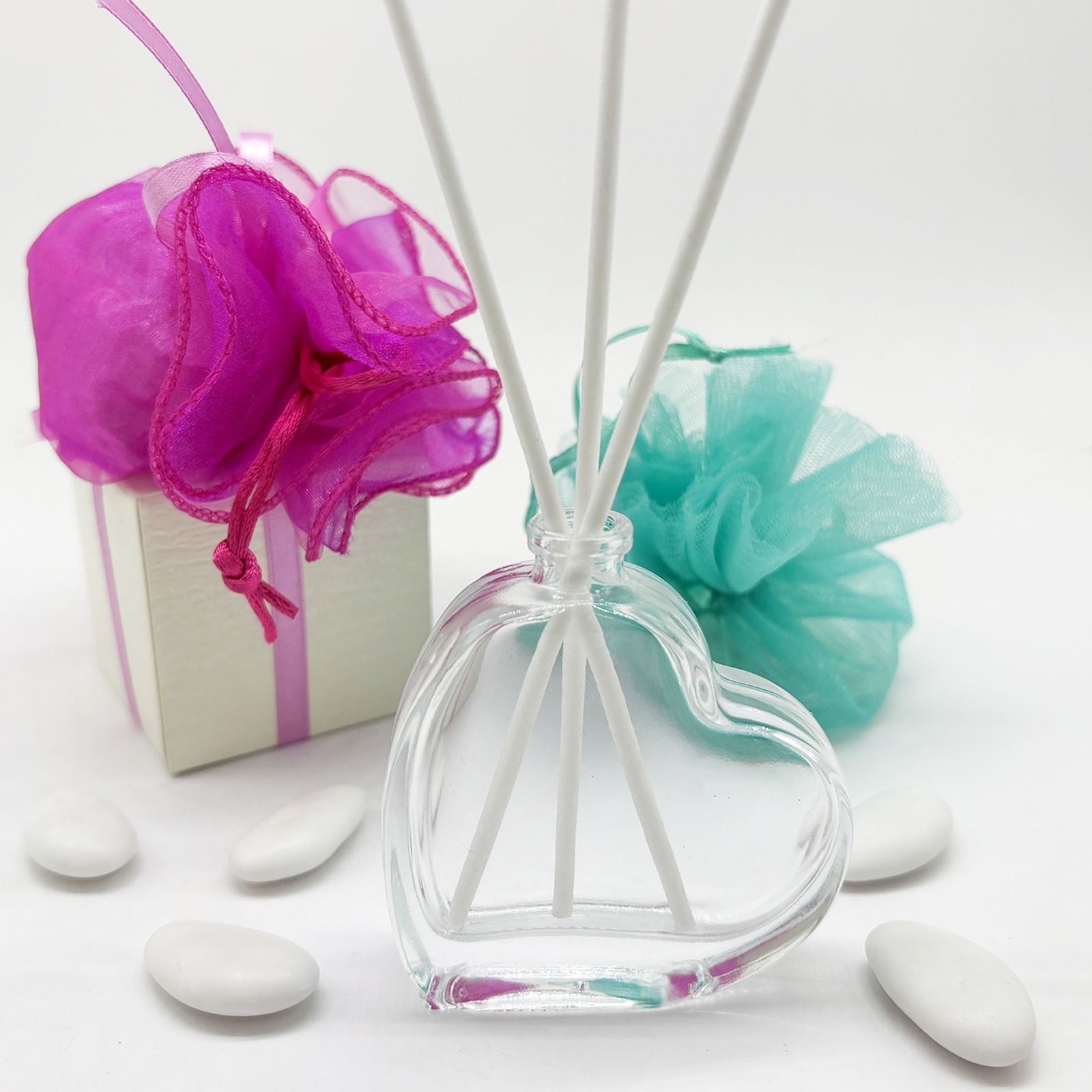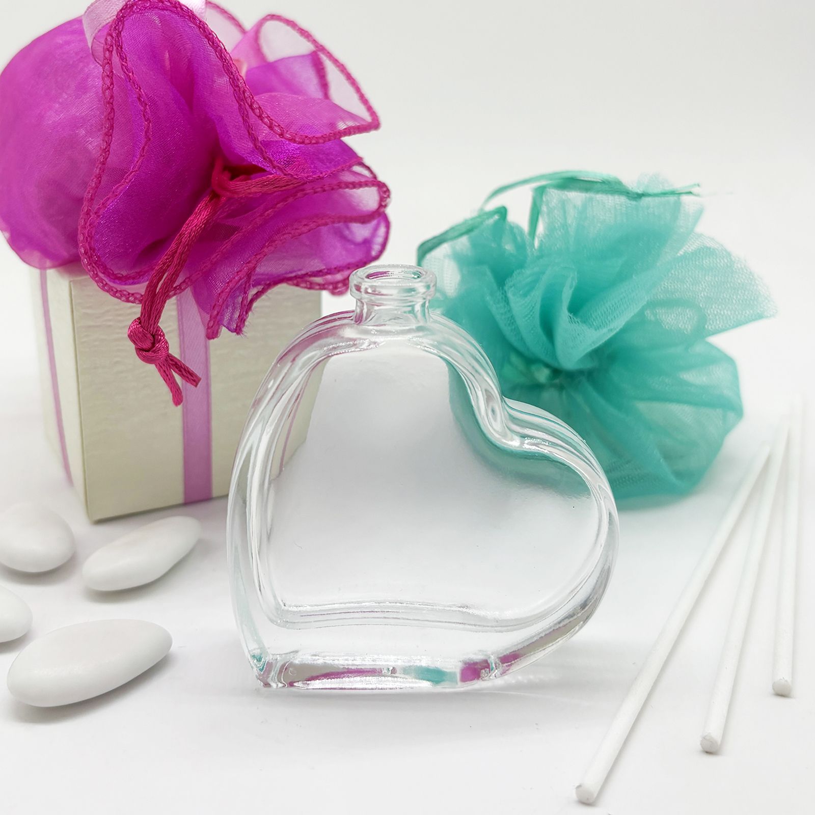 Il nostro diffusore essenza a forma di cuore è l'oggetto perfetto per aggiungere un tocco speciale alle tue bomboniere fai da te. Realizzato in vetro, questo diffusore è ideale per essere utilizzato nella creazione di bomboniere per matrimoni e anniversari, aggiungendo un tocco romantico e rilassante.